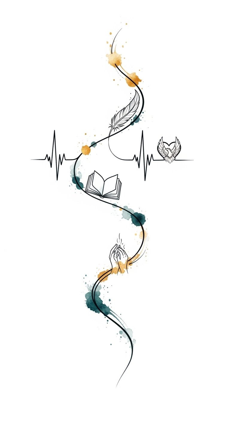 These markings forge an emotional connection, blending art with the soul, enabling you to embrace your story and celebrate your individuality in a world hungry for authenticity. The design’s path and heartbeat represent life’s continuity and pivotal moments; the book symbolizes remembered lessons, the feather conveys rebirth and healing, and the hands denote relationships and support.