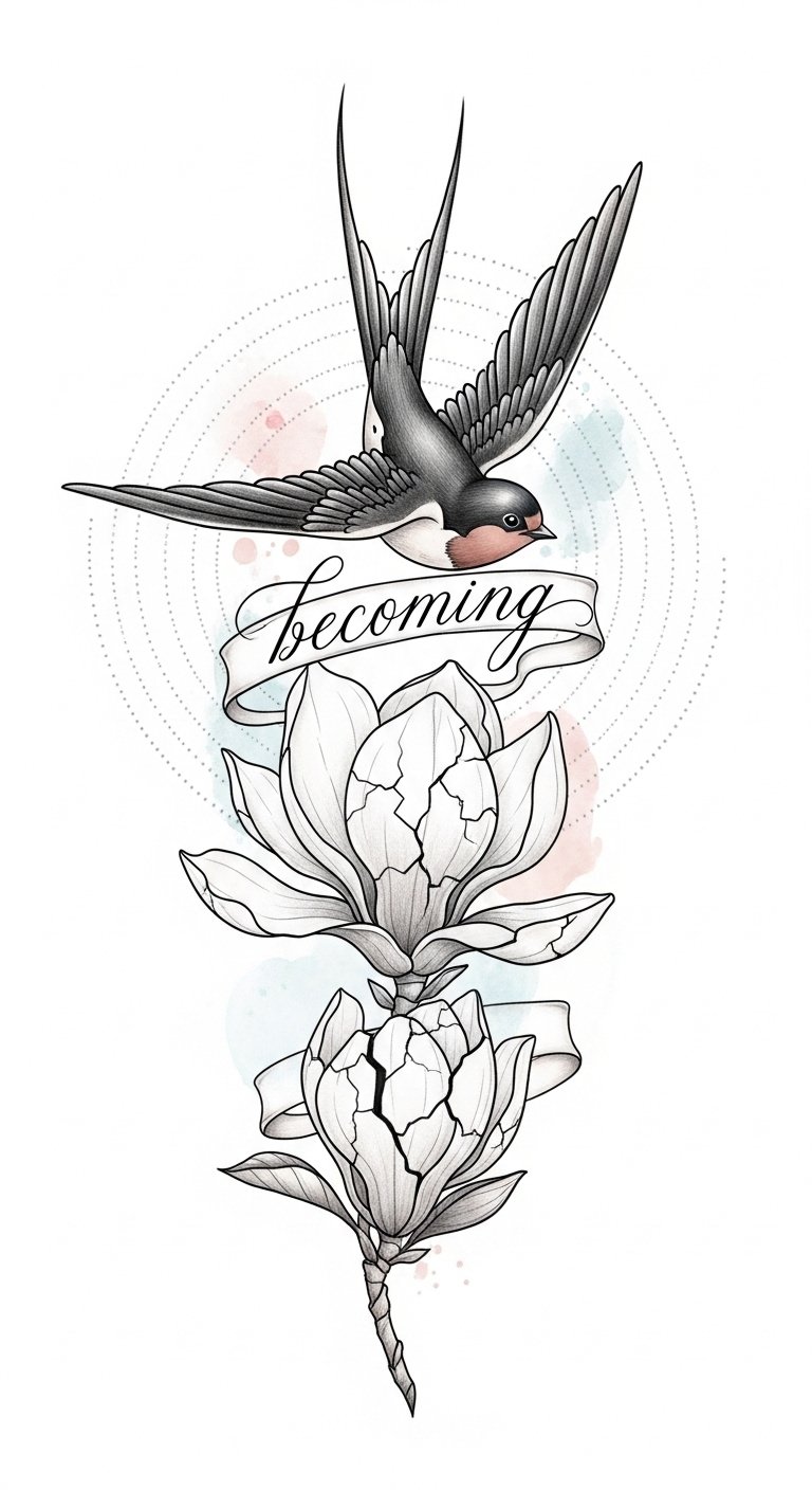 Each element reflects the original text’s layers of meaning: the swallow embodies freedom and the journey, the cracked magnolia symbolizes resilience and beauty emerging from hardship, and the “becoming” ribbon ties to personal stories and evolving identity.