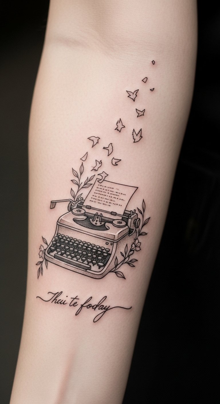 The design channels the original text’s themes of storytelling, personal milestones, and creative expression: the vintage typewriter represents narrative and voice; the pages turning into birds symbolize ideas taking flight, freedom of expression, and influence spreading outward like trends; the floral vines suggest growth and identity blossoming over time; the single cursive word anchors the piece as a personal touch reflecting a meaningful moment.