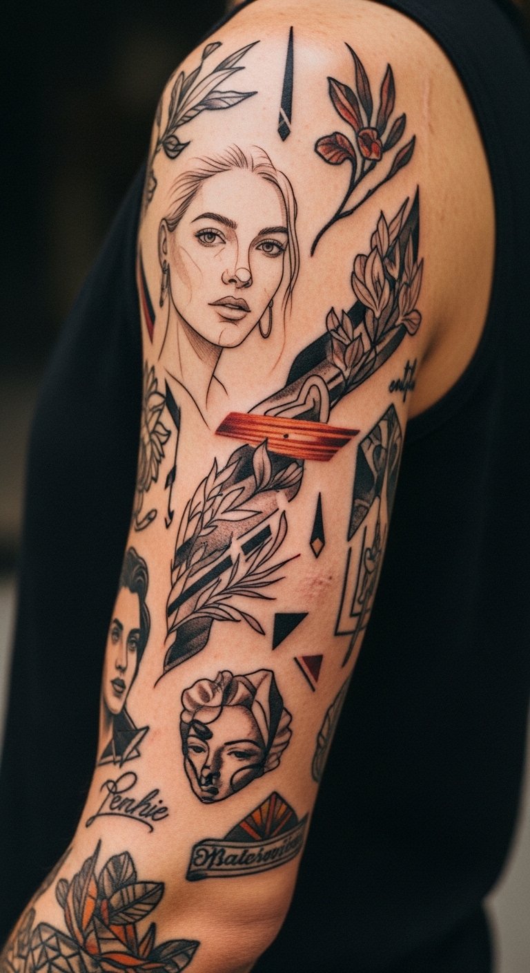 Placement across the forearm wrapping to the shoulder creates a readable timeline: intimate scripts near the wrist, personal portraits mid-forearm, botanical growth toward the bicep, and abstract, open brushstrokes on the shoulder to suggest ongoing evolution.