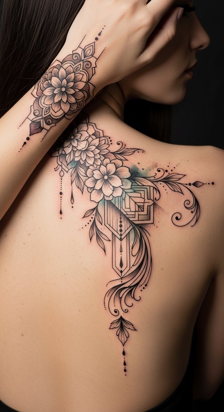 Celebrate your individuality by merging these two expressive worlds. The design symbolizes the convergence of sartorial identity and personal narrative: the wrist piece represents daily, visible self-expression—delicate florals and filigree for intimacy—while the expansive back mural embodies bold life stories and transformation, the geometric accents grounding the organic forms.