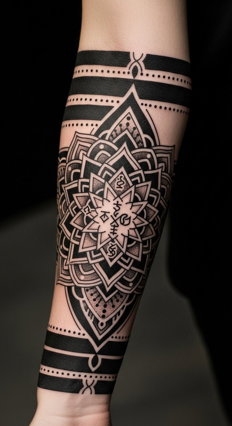 Consider placement on the inner forearm for daily personal affirmation or over the chest near the heart to emphasize spiritual connection; the symmetry evokes stability, the negative space invites introspection, and the interplay of bold and fine lines conveys resilience tempered by grace.