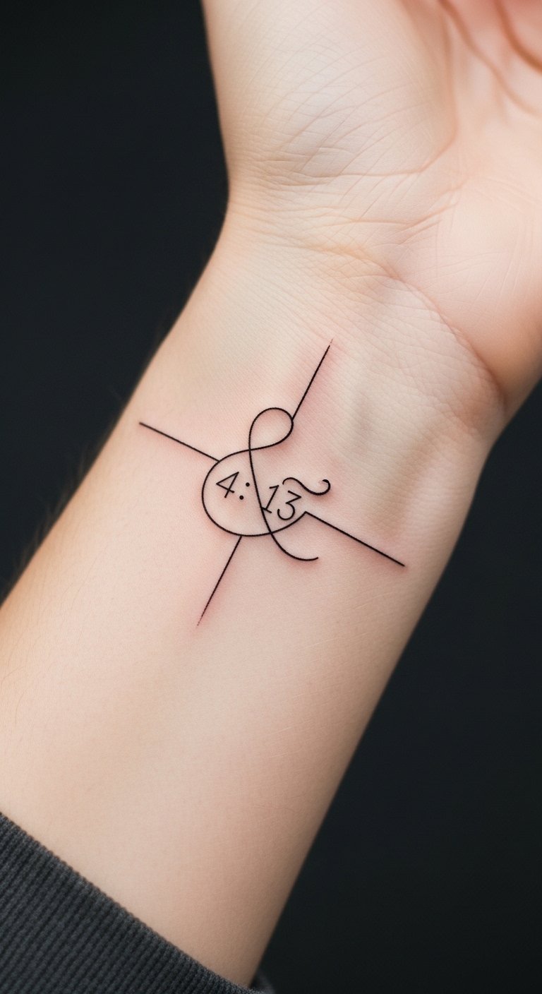 The ampersand symbolizes continuity and connection, the integrated “4:13” is a discreet personal anchor, and the single flowing line evokes resilience and unbroken faith; placed on the inner wrist it offers a private, tactile reminder that’s both intimate and visible, conveying calm confidence and quiet empowerment.