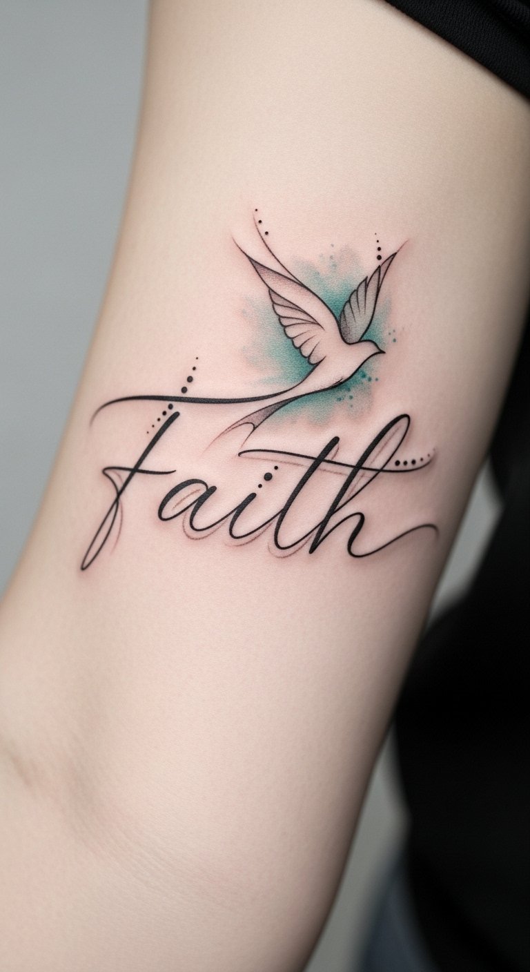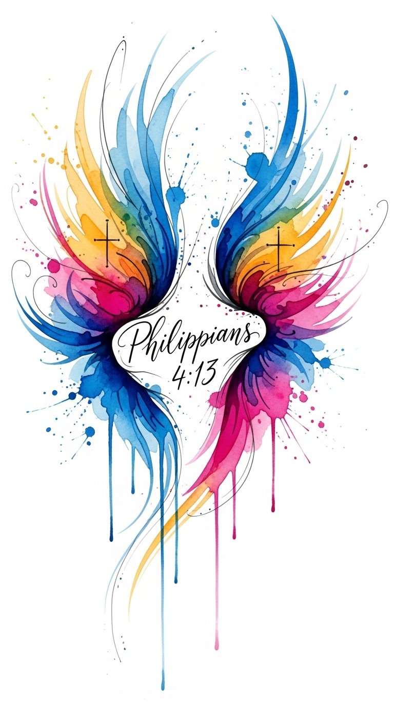 The design symbolizes strength and freedom through the wing motif and dynamic watercolor strokes, invoking empowerment each time you gaze at your tattoo; the vibrant color palette and fluid blending express faith as living energy, while the subtle crosses and handwritten script anchor the piece in personal belief.