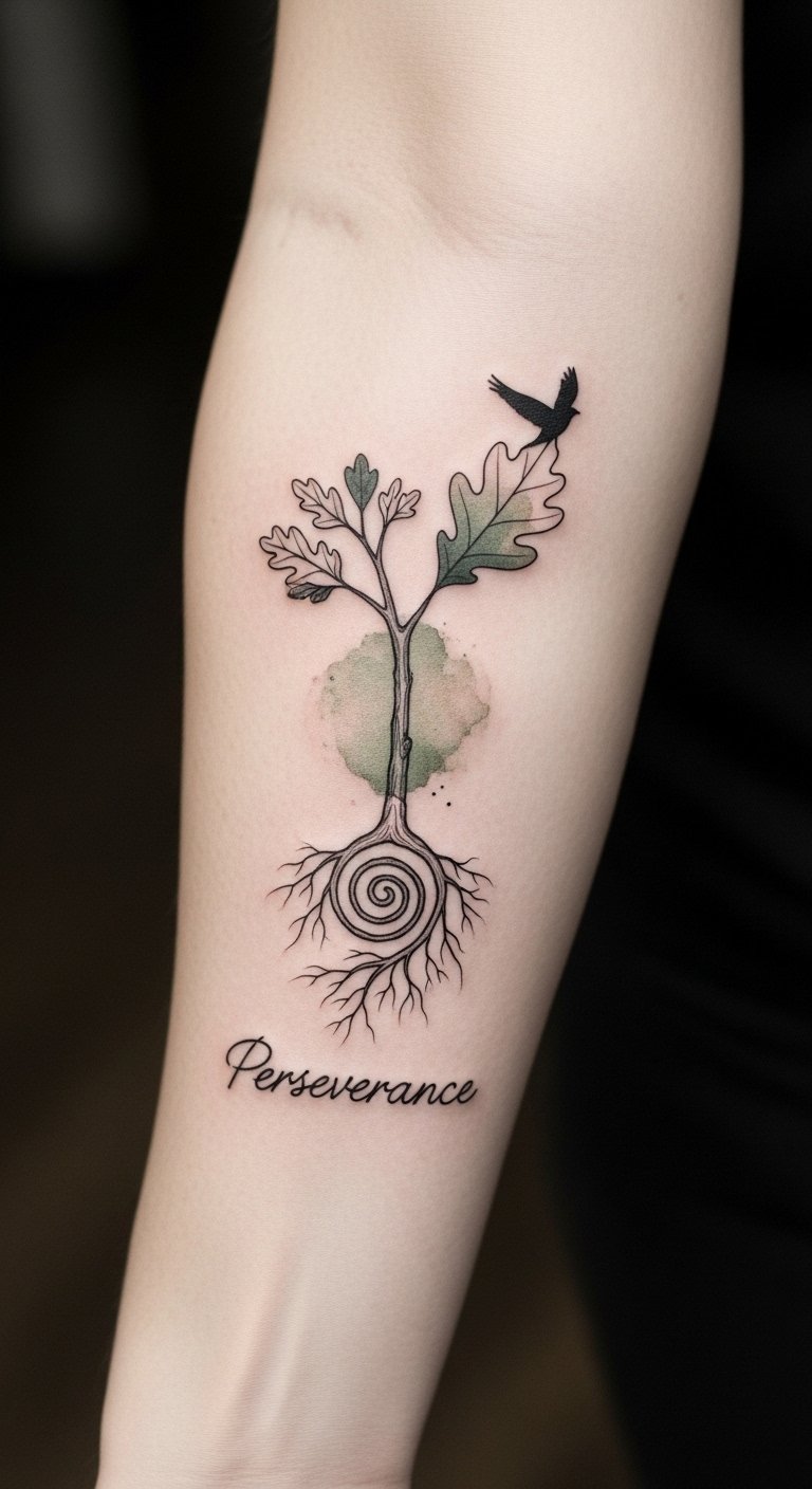 The sapling symbolizes growth from hardship, roots in a spiral for the cycles of struggle and learning, and the leaf-bird transition captures transformation and liberation; the watercolor wash adds emotional softness while the fine-line style keeps it personal and understated. Ideal placement is the inner forearm for frequent visibility and contemplation, or over the ribcage for a private reminder; the design evokes quiet determination, hope, and the ongoing courage to move forward.