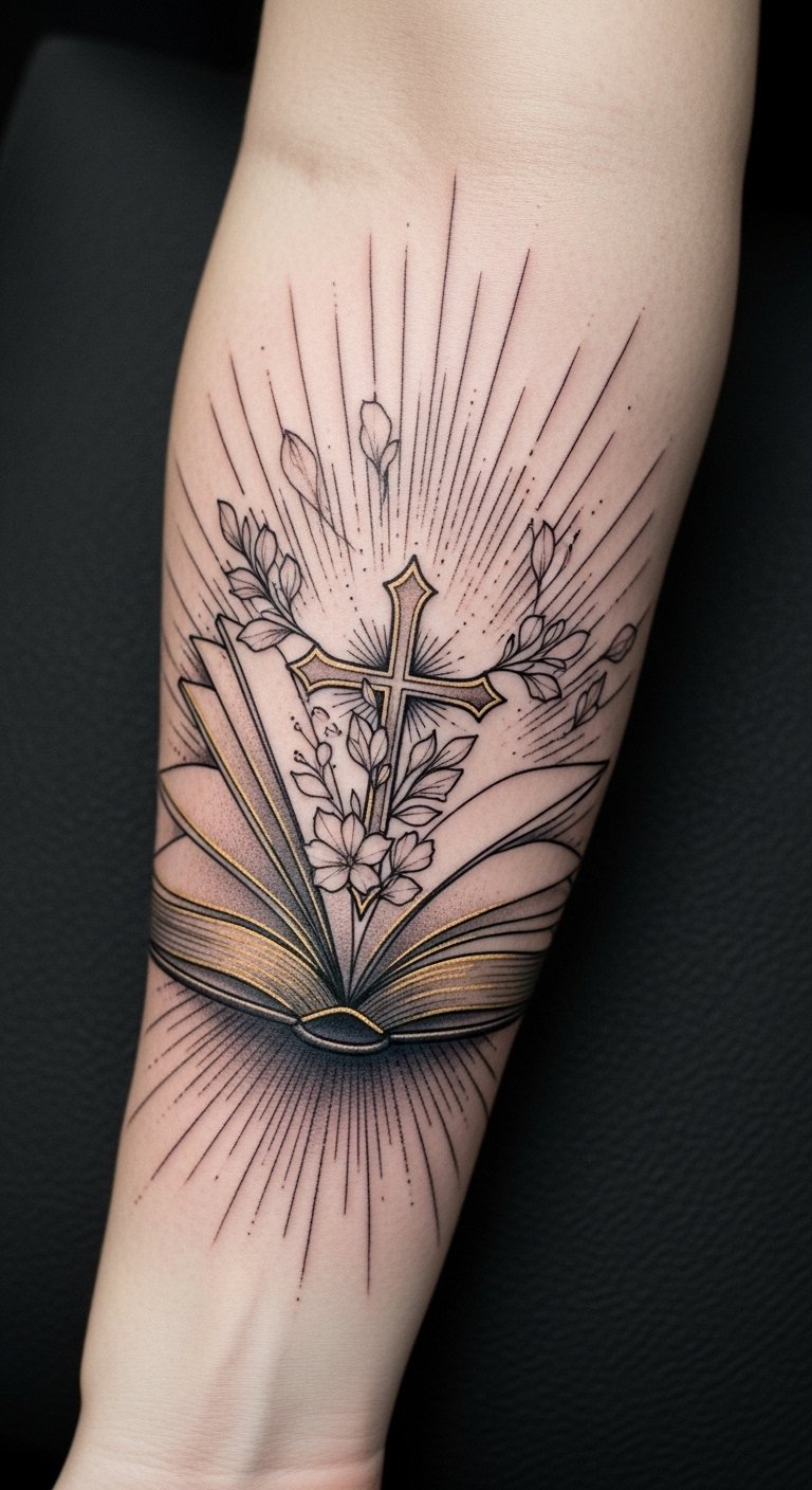 This design symbolizes knowledge and faith combined—the open book represents testimony and personal narrative, the light rays signify revelation and hope, the cross anchors spiritual conviction, and the flowers soften the image with grace and growth; emotionally it communicates openness, courage, and invitation.