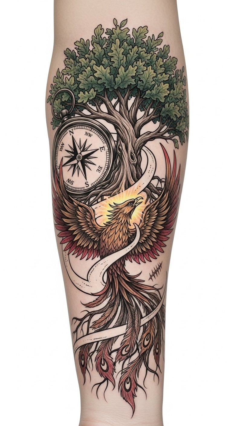 This piece blends the compass as guidance, the oak’s roots representing grounded endurance, and the phoenix’s ascent as renewal; the watercolor palette evokes emotion without overpowering the fine-line realism, making it suitable for the outer forearm or wrapping slightly toward the wrist so the imagery reads both in stillness and motion.