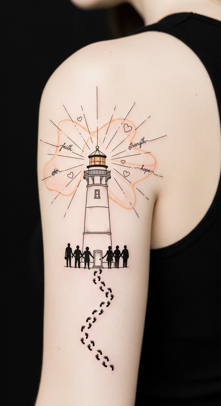 As a tattoo, this design uses the lighthouse as a central beacon representing guidance and resilience, the footprints indicating a personal journey others can follow, and the hidden words along the rays as intimate affirmations woven into light; the connected silhouettes embody community support and shared experience.