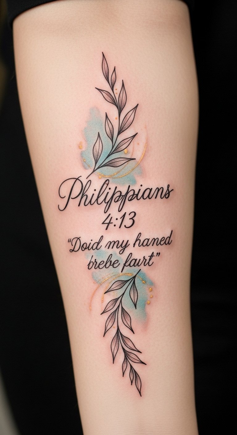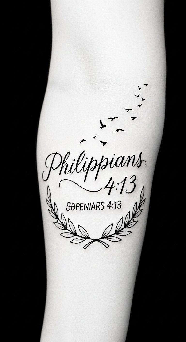 While choosing a Philippians 4:13 tattoo can be a powerful expression of your faith, combining it with other quotes can deepen its personal significance. These creative combinations enhance tattoo symbolism, layering meanings that resonate emotionally. By weaving personal narratives and unique designs into your ink, you create a tapestry of spiritual significance that embodies your journey and represents your unwavering faith. Meaningful quotes can amplify that message beautifully. This design symbolizes strength supported by personal testimony—the laurel vine represents victory and growth, the watercolor tones evoke calm resilience, and the secondary quote offers intimate context; emotionally it reads as hopeful and grounded. Ideal placement is along the inner forearm or ribs where the script follows natural lines, visible yet private, allowing the wearer to trace both scripture and personal narrative.
