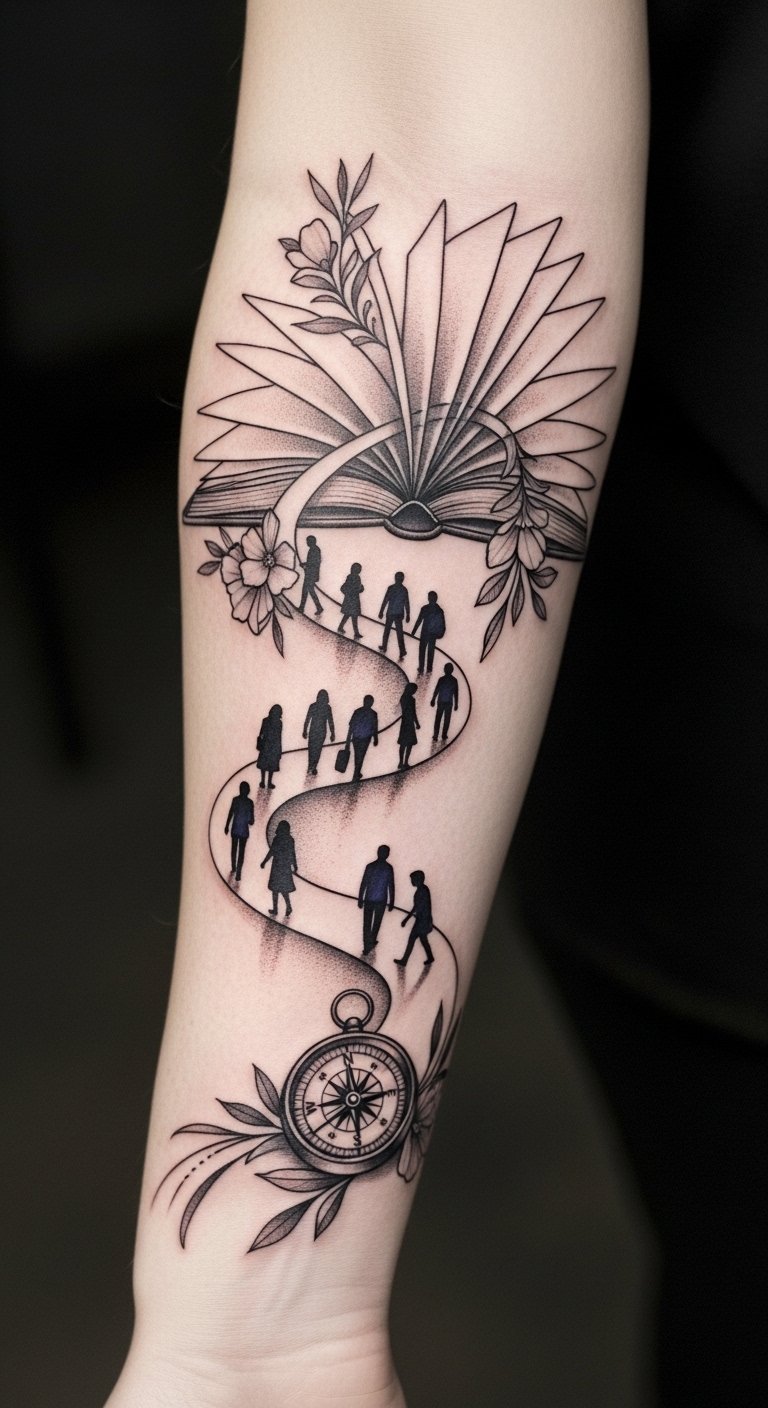 Placed along a curved band—wrapping the forearm, upper arm, or side/ribcage—the layout allows each element room to breathe while forming a cohesive visual narrative; the muted palette keeps it timeless and versatile, fitting both subtle and bold personal statements.