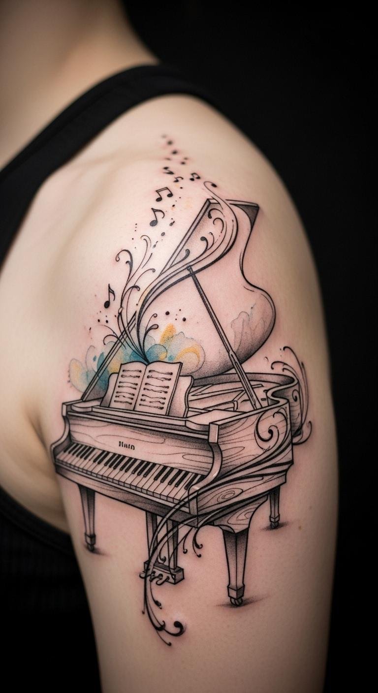 An elegant piano tattoo on your shoulder can transform your body into a canvas of musical artistry, beautifully blending intricate design with personal significance.
