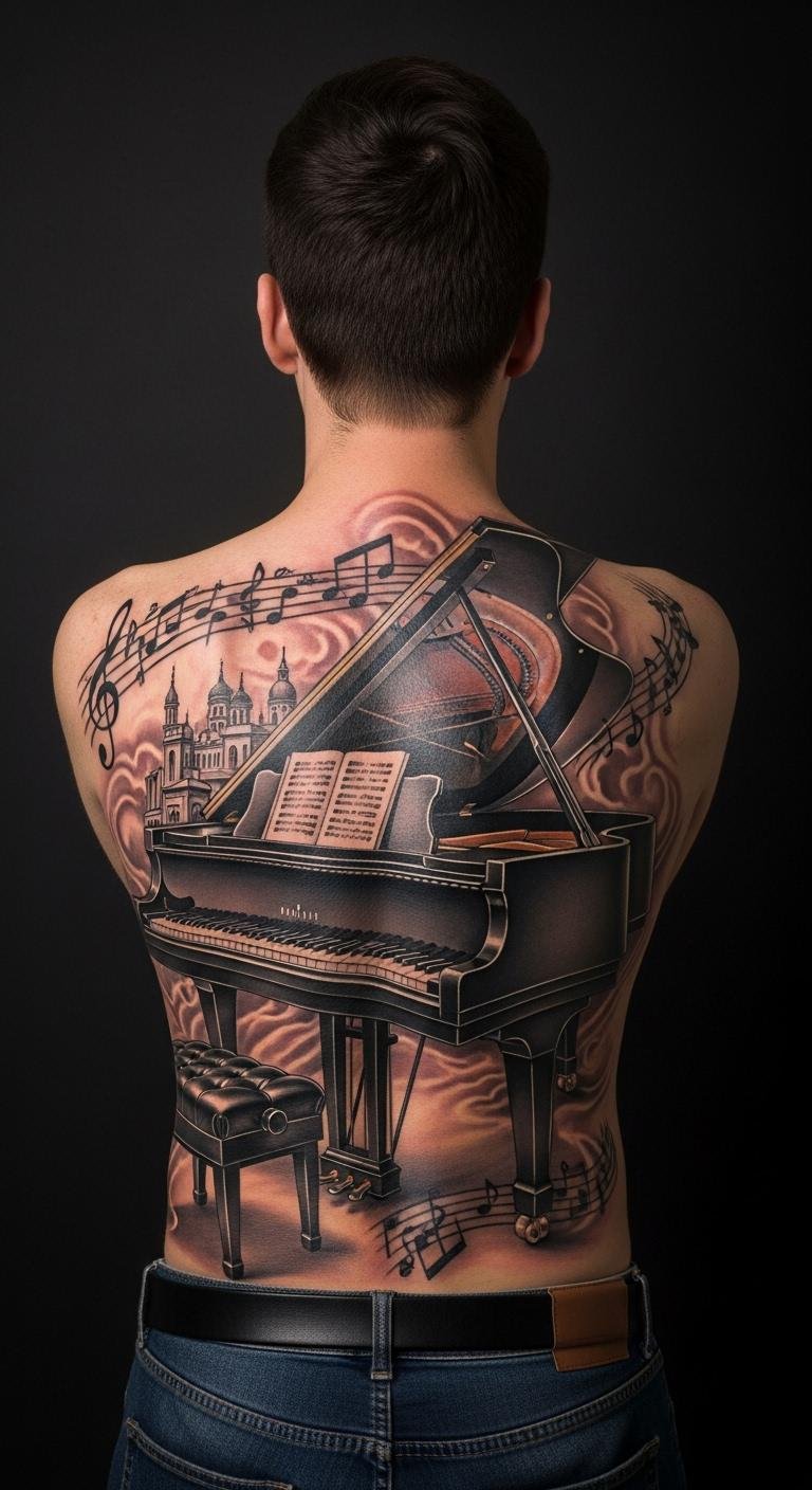 Imagine the grand piano inked across the expanse of the back as both a literal instrument and a living emblem of harmony and creativity; its sweeping curves follow the spine and shoulder blades, keys rendered with meticulous detail and subtle shading to suggest motion and sound.