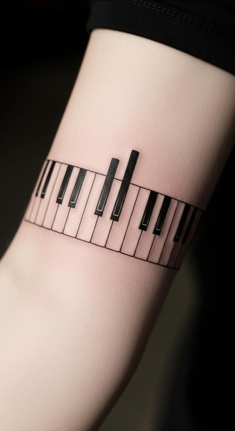 A minimalist piano keyboard tattoo captures the essence of music with elegant simplicity.