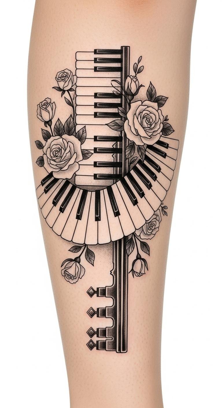 Emotionally, the tattoo evokes both serenity and romantic intensity—gentle lines of keys balanced by the organic curves of petals convey a lived-in, expressive musical life.