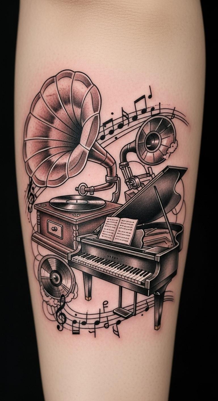 A vintage gramophone and piano tattoo symbolizes a deep reverence for music’s past—nostalgia, timeless artistry, and cultural memory—evoking warm, melancholic emotion and the tactile romance of analog sound.