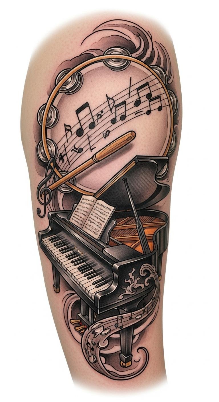 Piano and Tambourine Fusion Tattoo