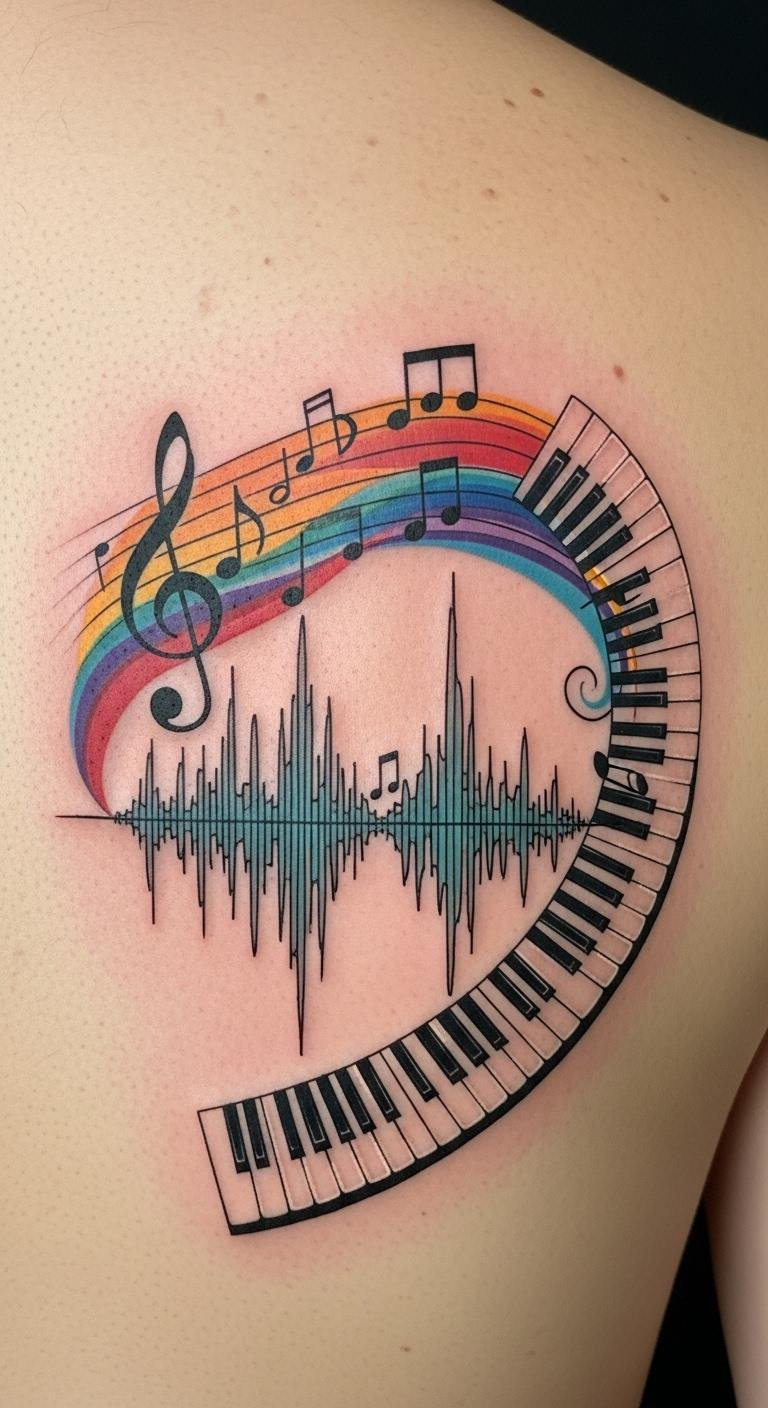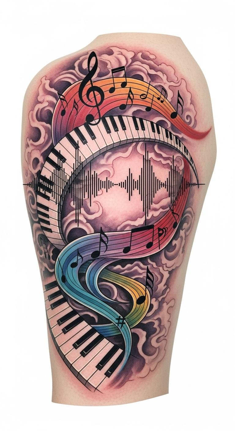 This design pairs flowing piano keys and staff lines rendered as vibrant, wave-like ribbons that wrap gently around the forearm or along the ribcage, interspersed with small symbolic elements—a single inked treble clef, a faded manuscript fragment, and subtle watercolor splashes to echo emotional tones. Symbolically it honors the transient nature of sound made permanent on skin, channeling storytelling and personal memory; emotionally it feels lyrical and intimate, meant to evoke both nostalgia and movement. Ideal placement follows natural curves—forearm, ribs, or along the clavicle—so the waves appear to dance with the body’s motion.