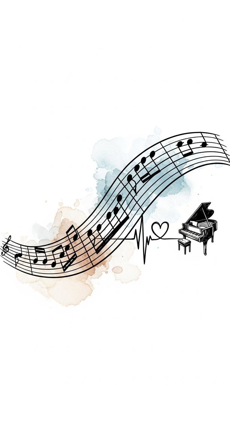 The design symbolizes the continuity of memory and emotion—the staff as a life line, the heartbeat woven through the notes to represent the living pulse behind each melody; watercolor tones evoke nostalgia while the piano silhouette anchors the piece in musical identity.