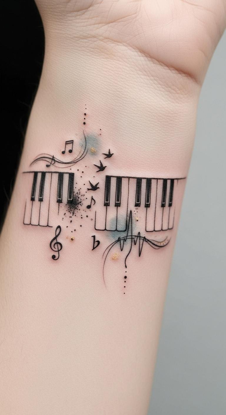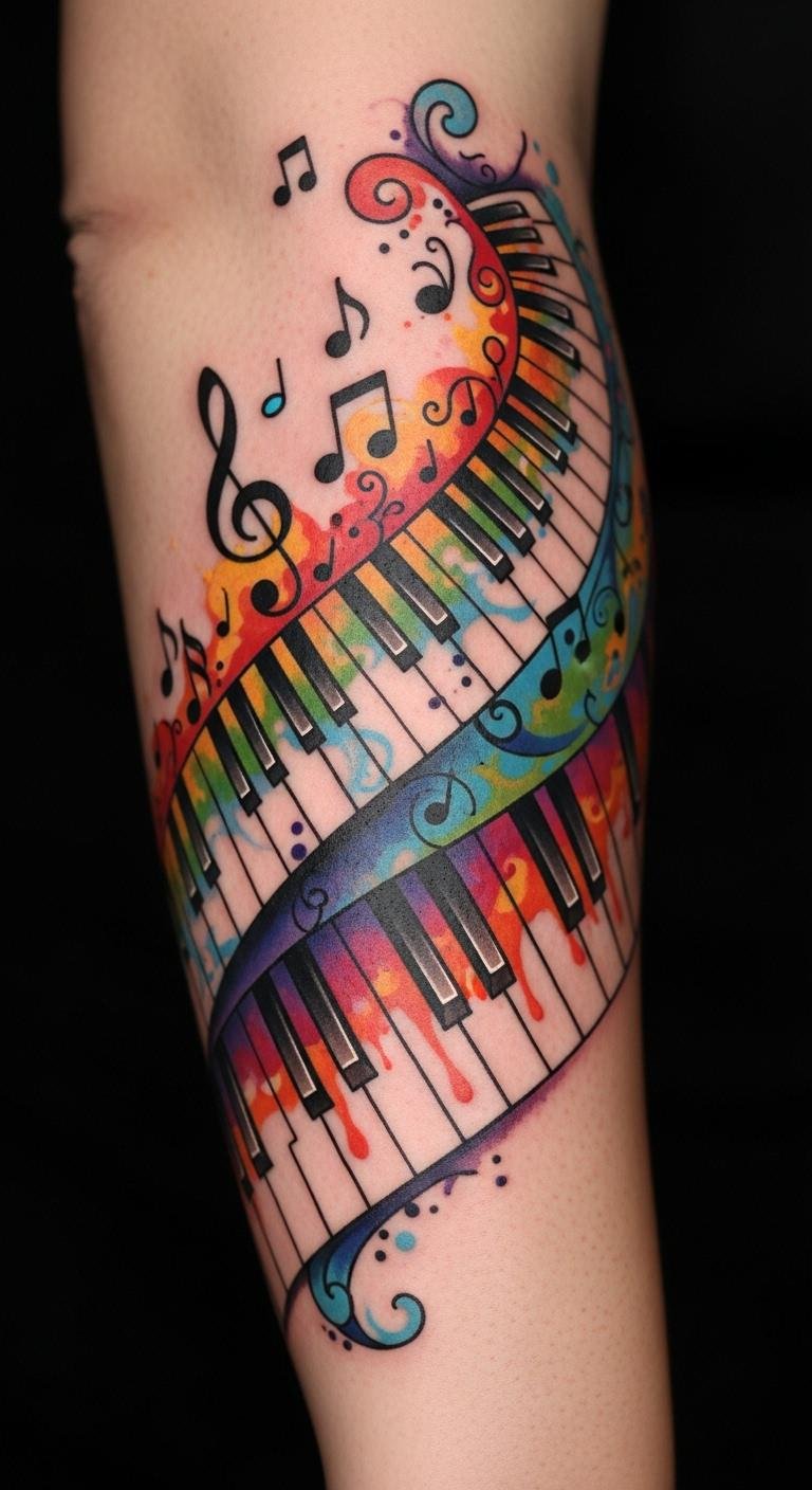 The interplay of stark keys and sinuous lines symbolizes discipline meeting improvisation, evoking emotions of longing, joy, and liberation; ideal placements like the forearm or ribcage let the composition move with your body, enhancing its narrative and visibility.