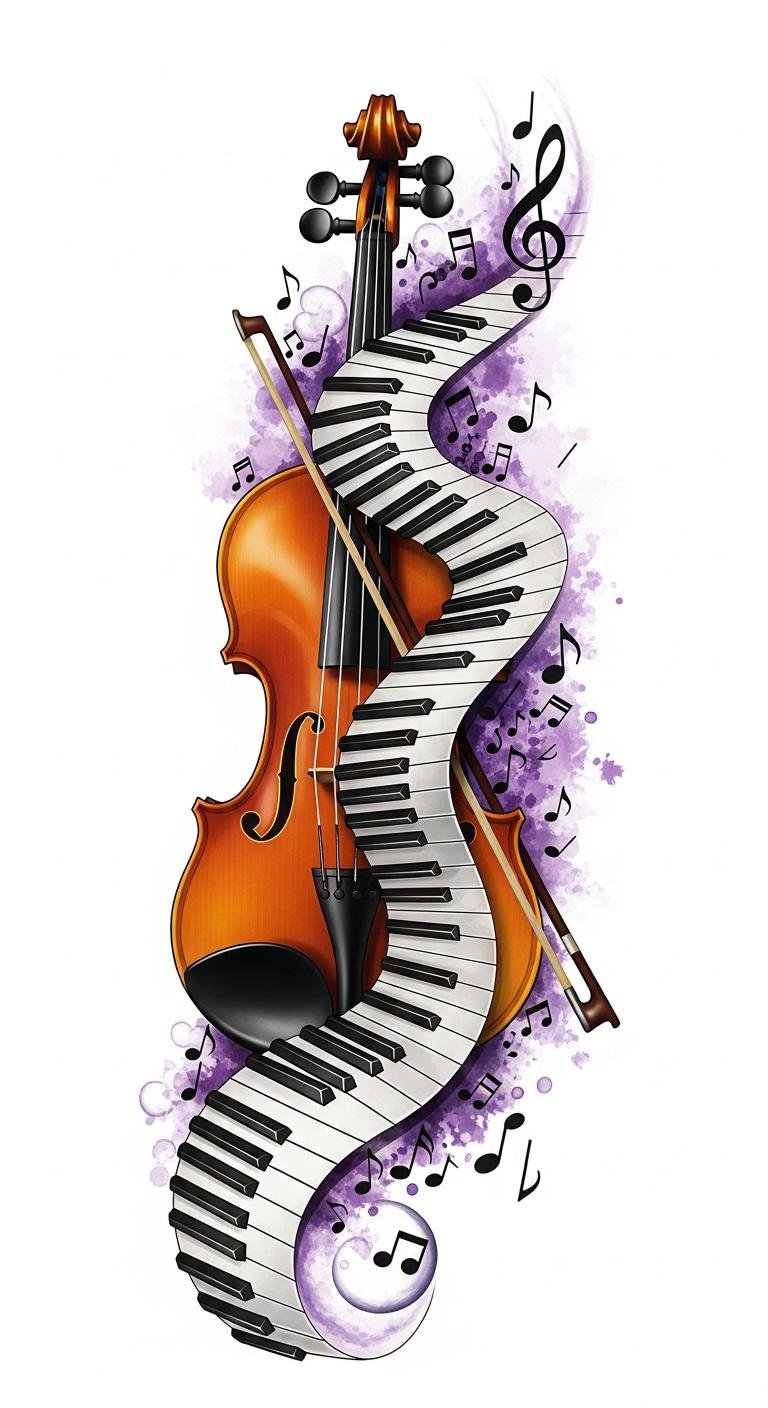 This design symbolizes the union of structure (piano keys) and lyrical expression (violin curves), conveying balance, creativity, and emotional release; its flowing lines and entwined elements evoke movement and the feeling of music lifting the spirit. Ideal placements include the forearm or ribcage for a vertical composition, the upper back or chest for a larger, centered piece, or along the calf for a dynamic wraparound effect, each allowing the design to follow the body’s natural contours and express personal connection to music.