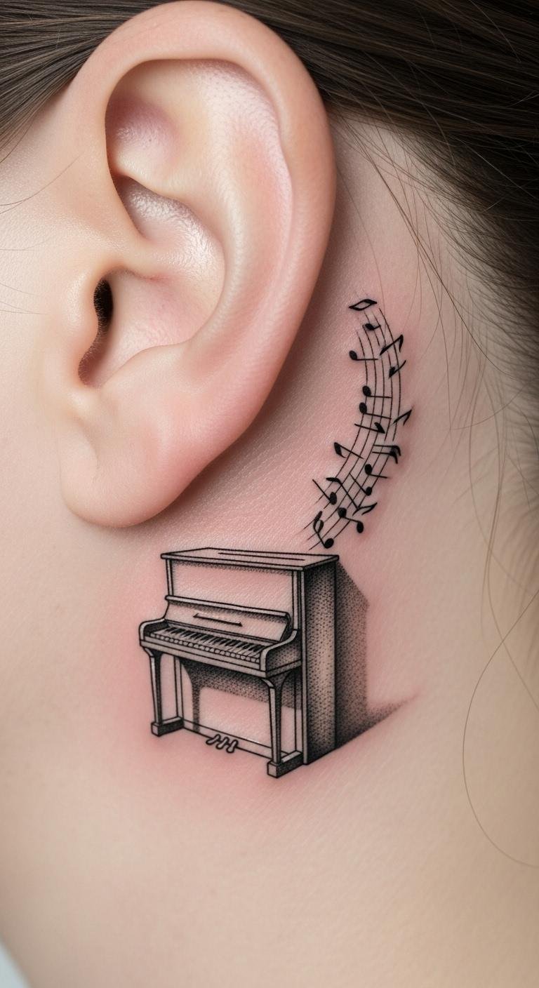 Small Piano Tattoo Behind the Ear