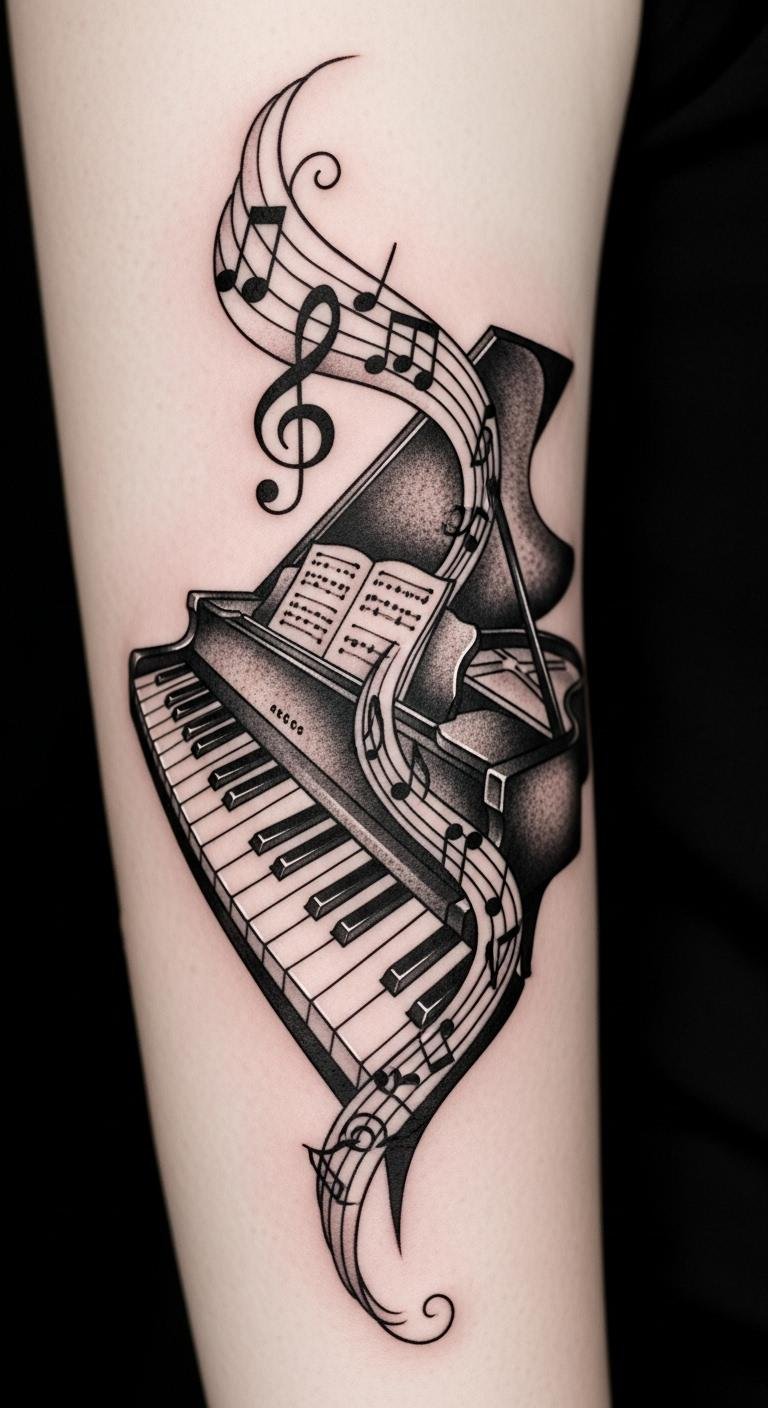 Classic black and white piano ink tattoos convey a blend of refined artistry and personal narrative: the piano keys can symbolize structure and discipline, flowing notes suggest creativity and movement, and high-contrast shading evokes intensity and clarity of purpose.
