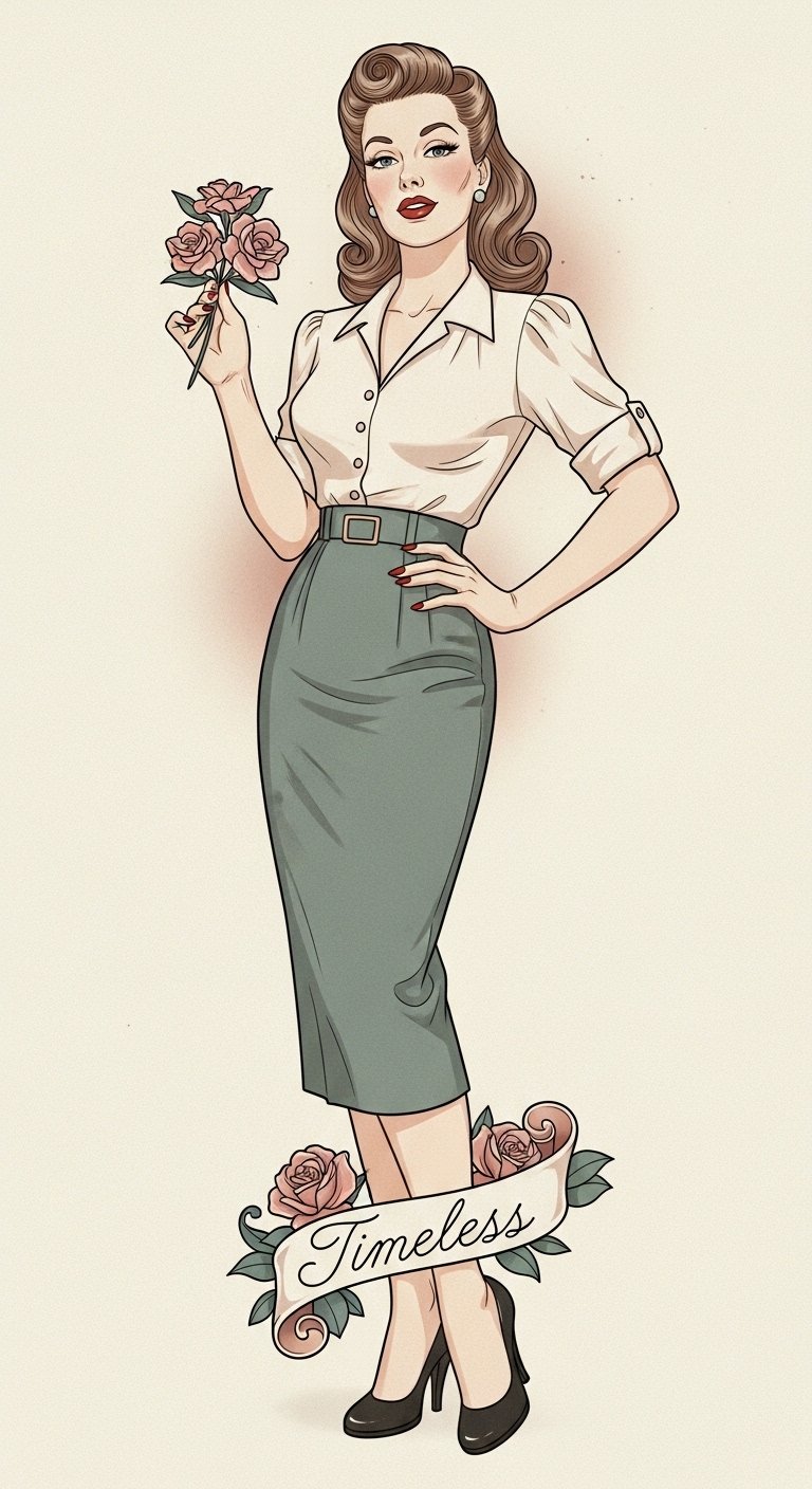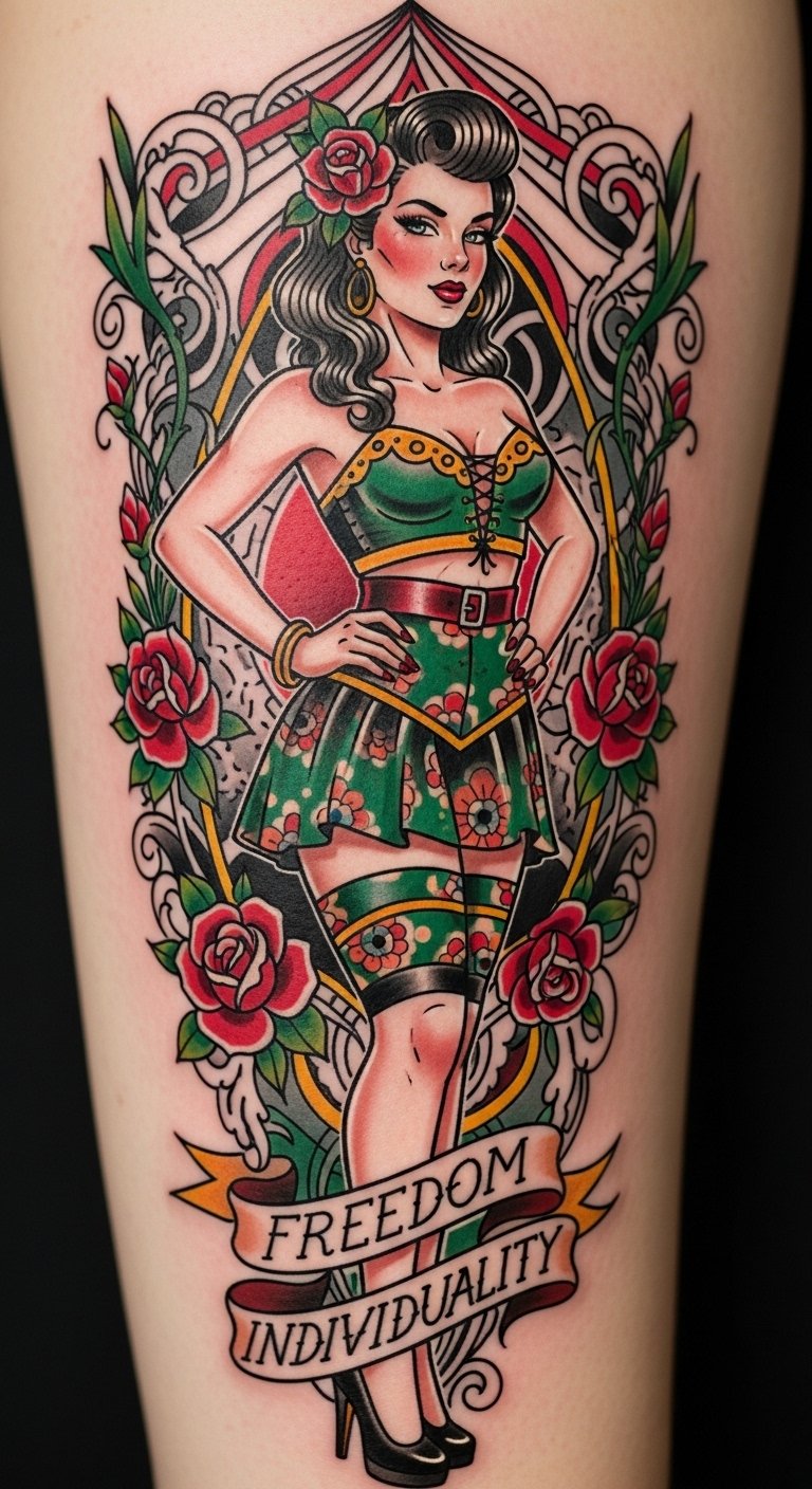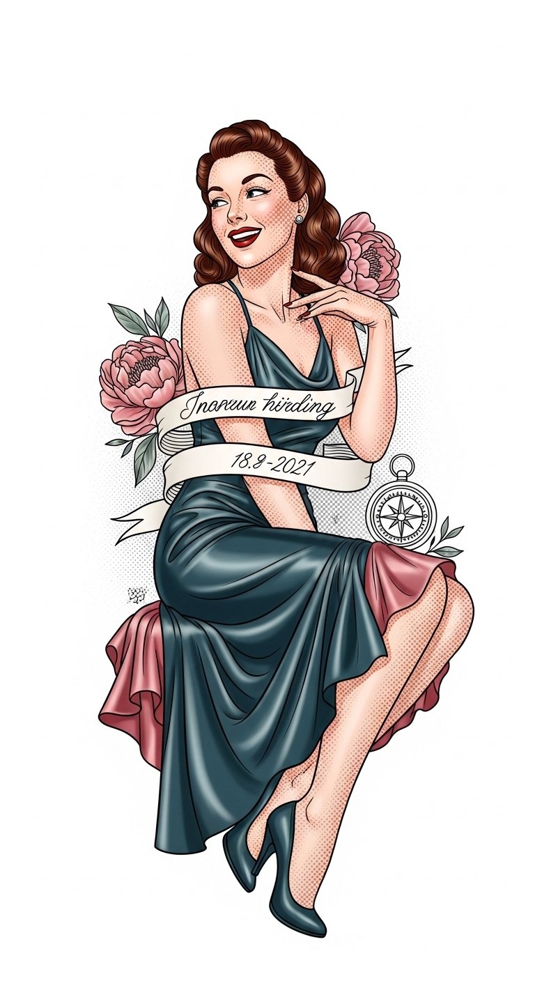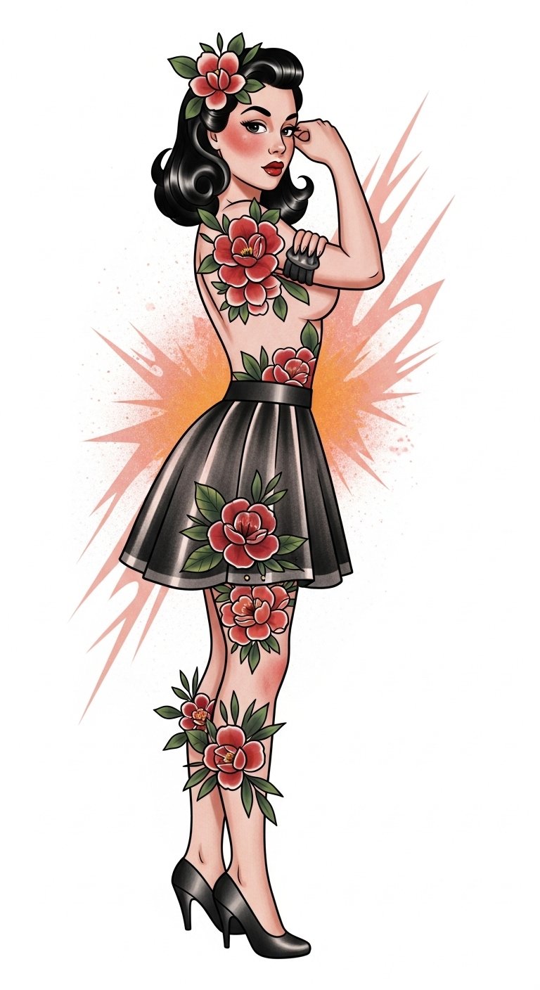 The design uses classic pin-up posture and wardrobe to balance vintage glamour with modern tattoo culture; floral motifs symbolize growth and resilience, script elements can include personal affirmations, and bold colors evoke empowerment.