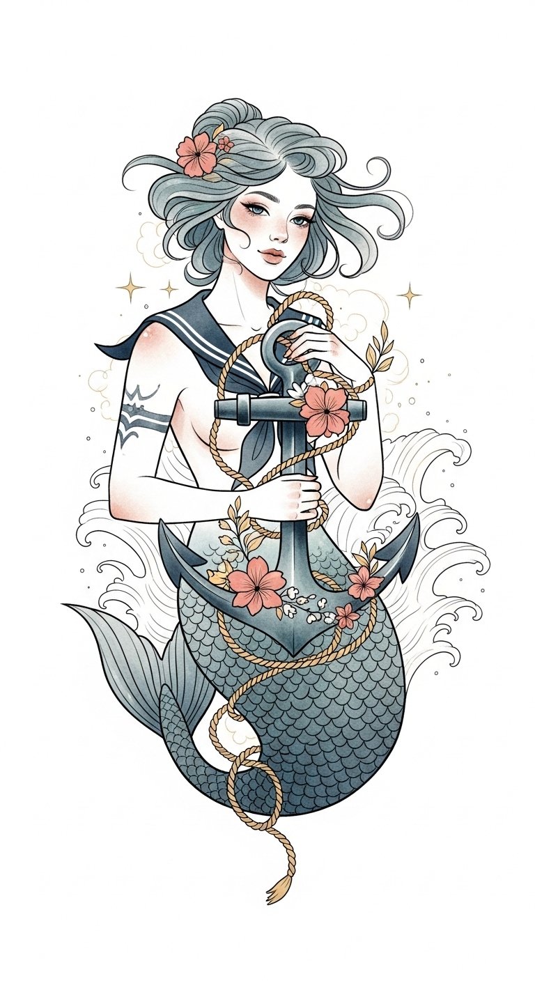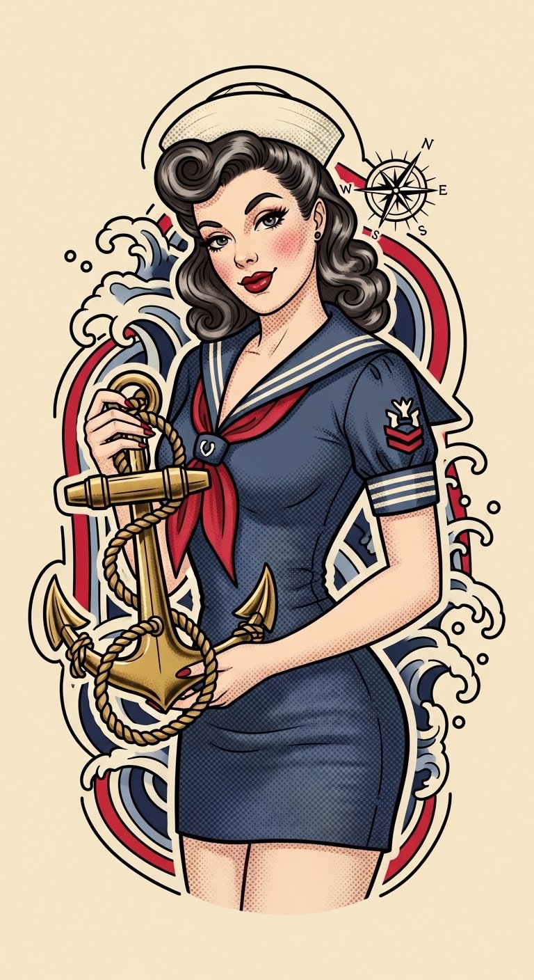 This piece symbolizes independence and wanderlust, evoking nostalgia and bold femininity; ideal placement is the upper arm, thigh, or back shoulder where the figure’s lines complement the body’s natural curves and allow the anchor and rope details to flow with movement.