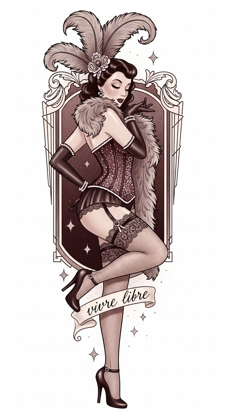 The feathered boa and lace garter suggest movement and texture, the art-deco elements frame the figure like a marquee, and the script adds a personal, defiant motto.
