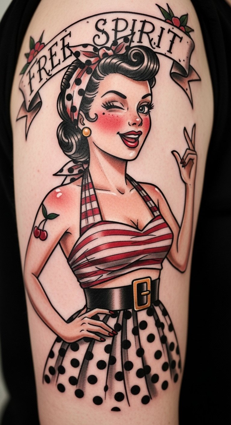This tattoo concept uses classic pin-up imagery—winking expression, retro hairstyle, polka dot or striped attire—to symbolize playful confidence and unapologetic self-expression; the cheeky outfit and lively pose convey joy and flirtatious empowerment, making it ideal for placement where it can be both private and revealed: upper arm, thigh, or shoulder blade to allow curving lines and dynamic movement that accentuate the body’s contours and invite interaction with light and motion.