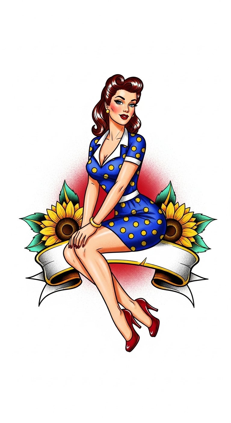 This design uses classic pin-up iconography—vintage swimwear, polka dots, and floral accents—to symbolize femininity, confidence, and playful self-expression. The saturated jewel tones and high-contrast highlights convey bold emotion and empowerment, while the stylized realism keeps the image approachable yet striking.