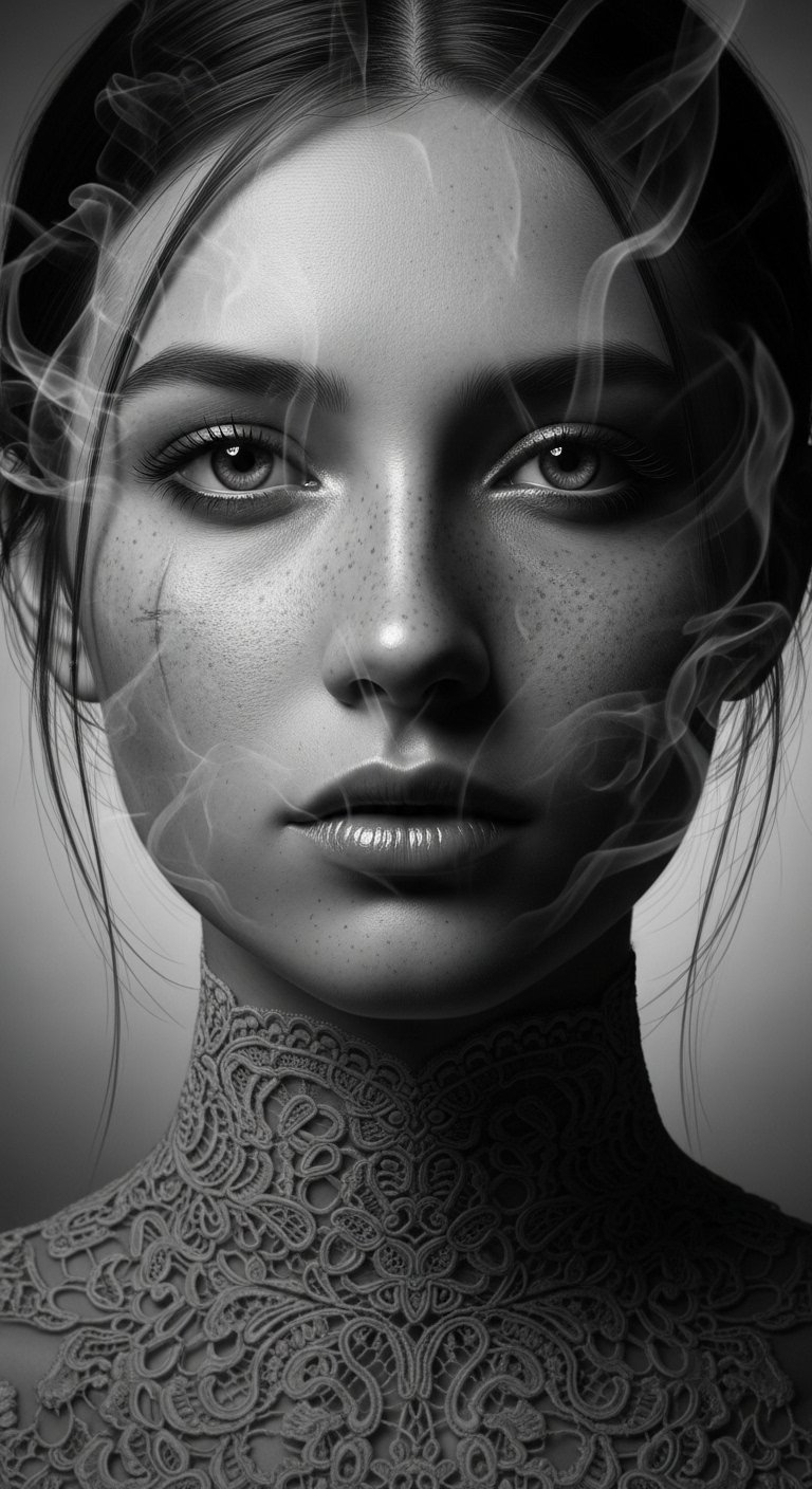 This design symbolizes resilience and memory — the smoke represents transient moments while the scar and gaze evoke personal trials overcome; emotionally it conveys quiet strength and introspection.