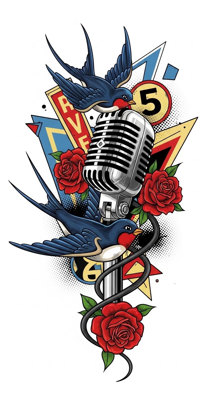 The design blends iconic rockabilly motifs—the microphone for music and voice, the swallow for travel and freedom, and roses for passion—rendered in bold, tattoo-friendly lines and vivid retro colors to convey energy and joy; halftone shading and geometric background elements tie to 1950s signage, creating playful movement that sits well on forearm or chest where it reads dynamically with the body’s motion and encourages visible self-expression.