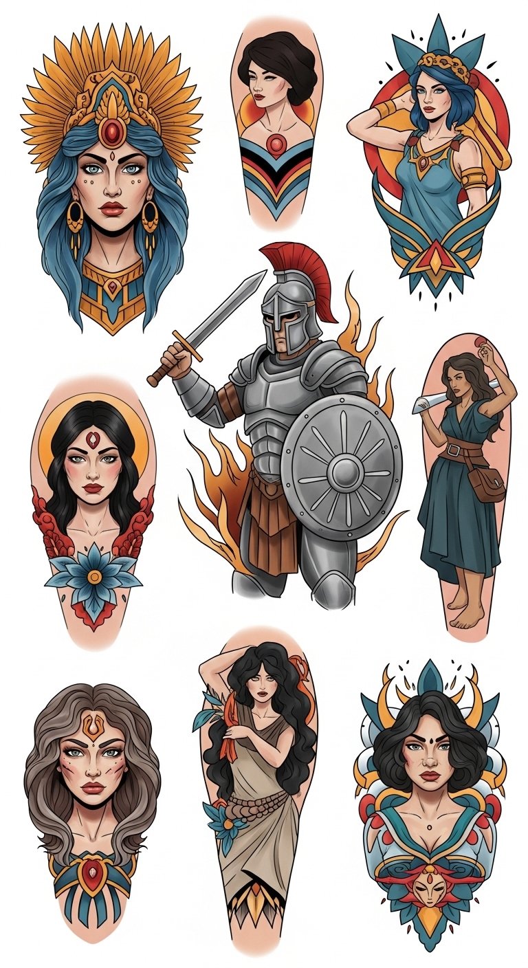 A tattoo design centered on a poised female figure combining elements of a goddess and a warrior: flowing hair morphs into laurel leaves and stylized flames, armor detailed with floral filigree and geometric patterns, and an outstretched hand holding a small, glowing symbol (sun or crescent). Rendered in fine-line black with selective gold and deep-red accents, sized to suit upper arm, ribcage, or back shoulder blade. Symbolism: laurel and flames for victory and transformation, armor with flowers representing strength tempered by grace, glowing emblem as inner power and resilience. Emotion: an uplifting balance of fierceness and serenity meant to inspire confidence. Placement: curved to follow muscle lines so it reads dynamically with movement and can be shown or concealed.