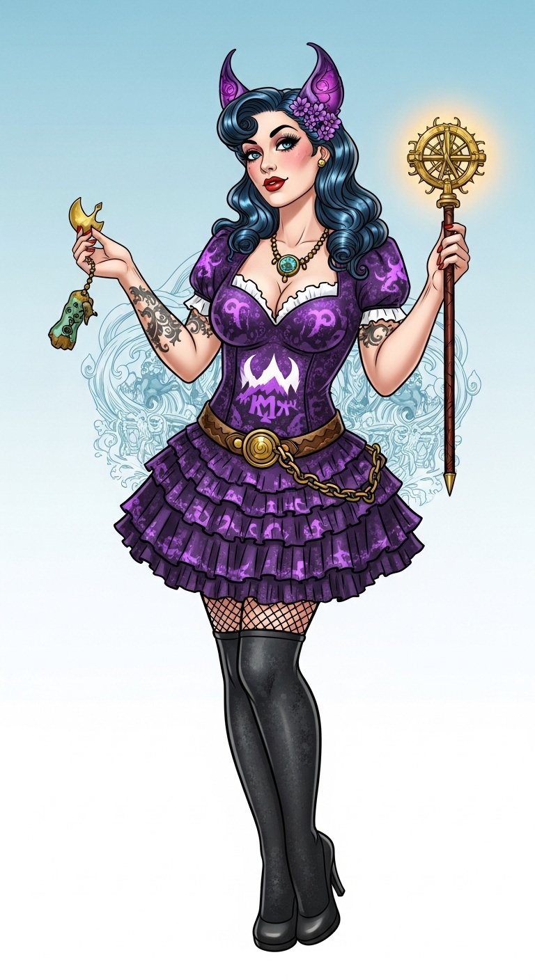 This design symbolizes empowerment, sensuality, and performative confidence—combining pin-up form with vintage accessories to evoke stage presence and feminine strength.