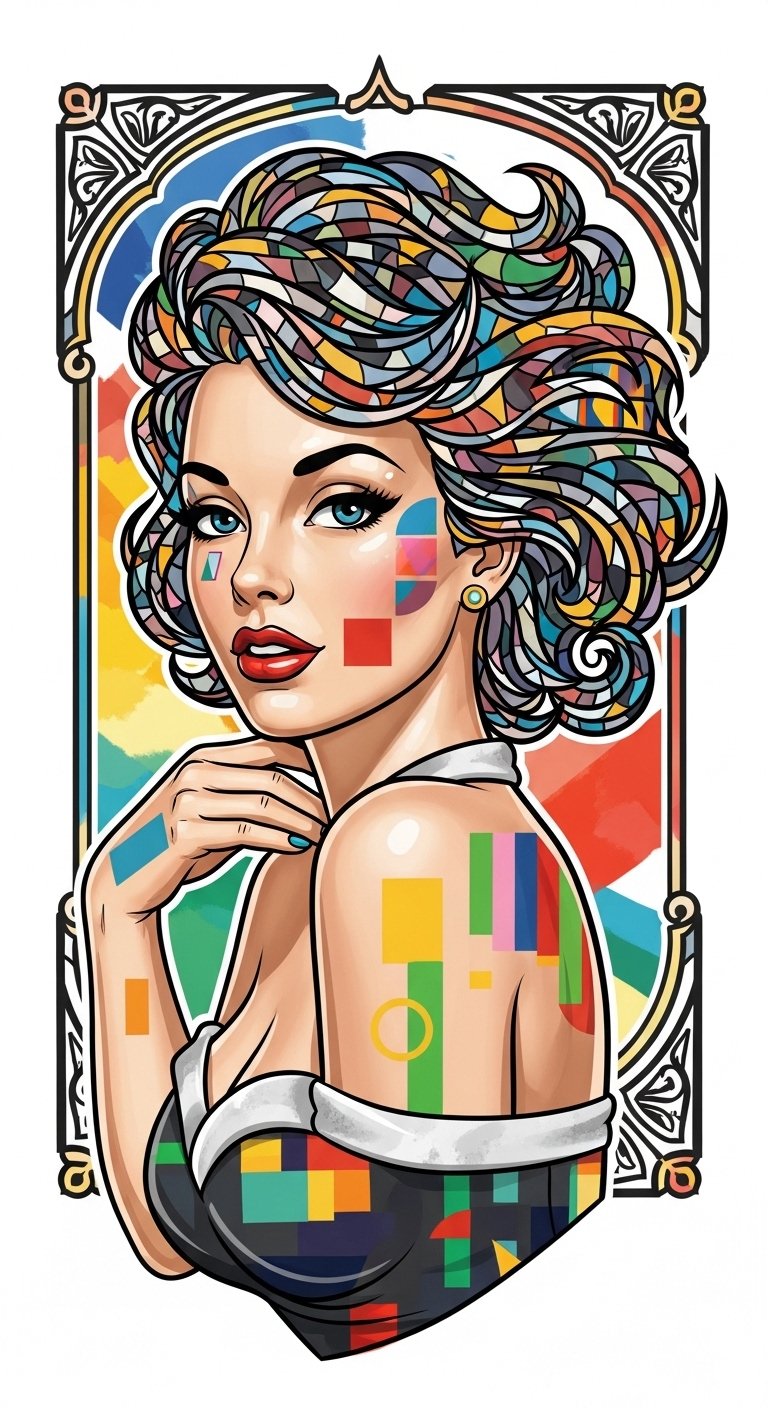 This design uses red to emphasize the sensual, blue to ground and calm the figure, and yellow to highlight playful energy; the mint and gold accents add freshness and warmth. Emotionally it celebrates confidence, nostalgia, and bold self-expression.