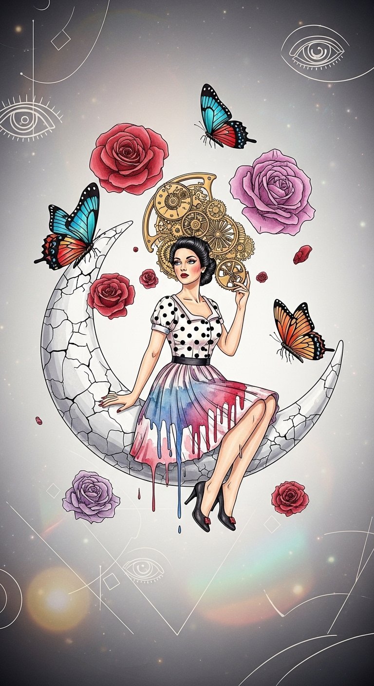 Place on the upper arm or thigh to allow for scale and movement; symbolism: cracked porcelain moon for fragility and rebirth, clockwork butterflies for transformation and time, floating roses for love and mystery; emotion: whimsical yet introspective, balancing nostalgia with bold self-expression.
