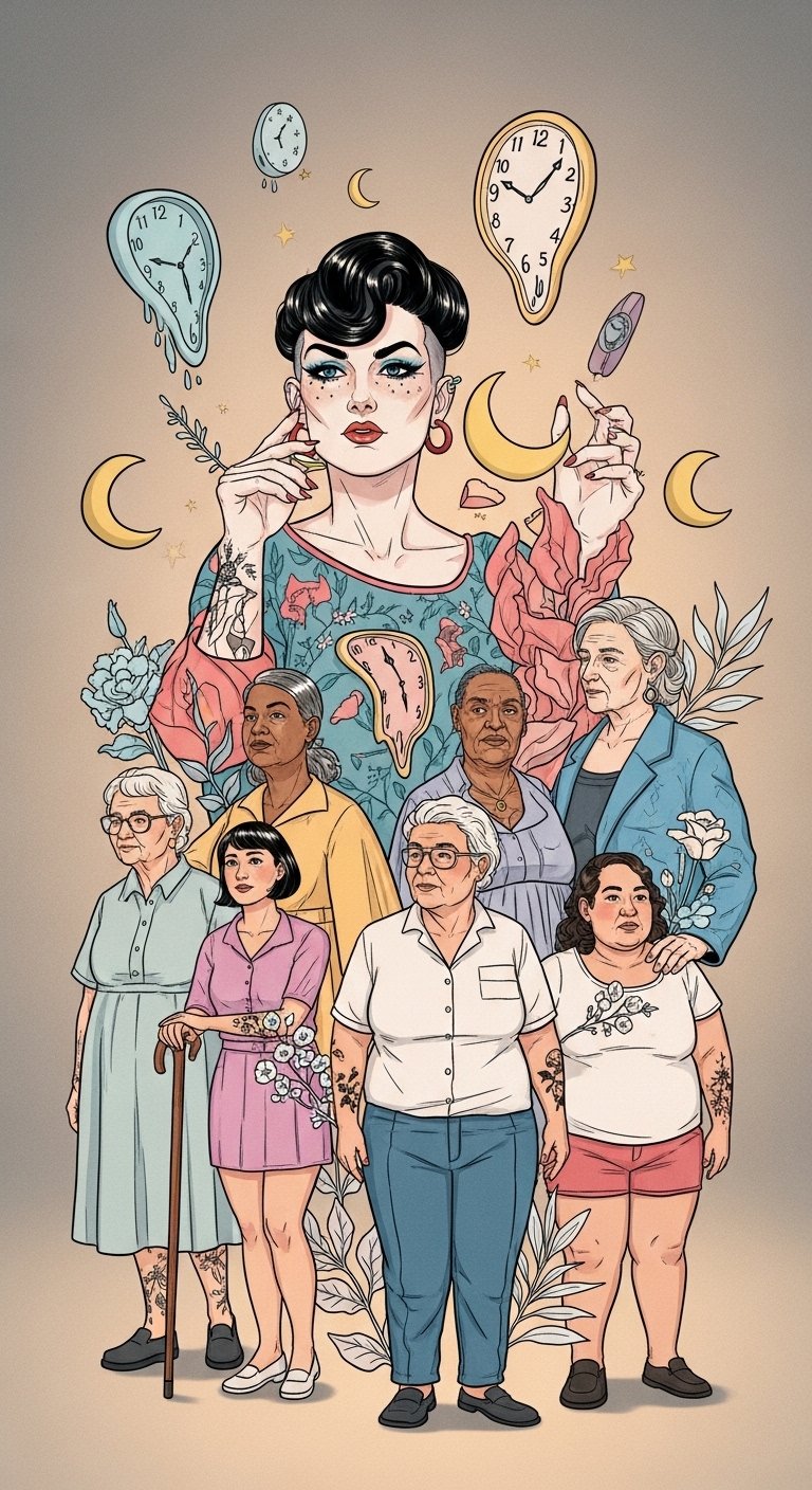 The design symbolizes unity across identities—melting clocks and moons signify fluidity of time and gender, while abstract flora and multicultural motifs weave personal histories into a cohesive image; emotionally the piece balances nostalgia and liberation, ideal for a back, chest, or full-sleeve placement where scale allows narrative details and flowing composition.