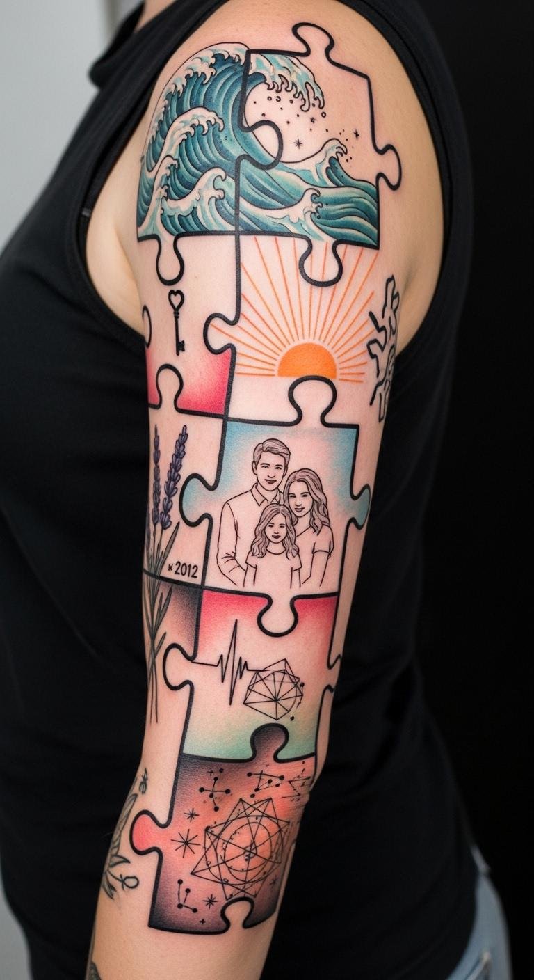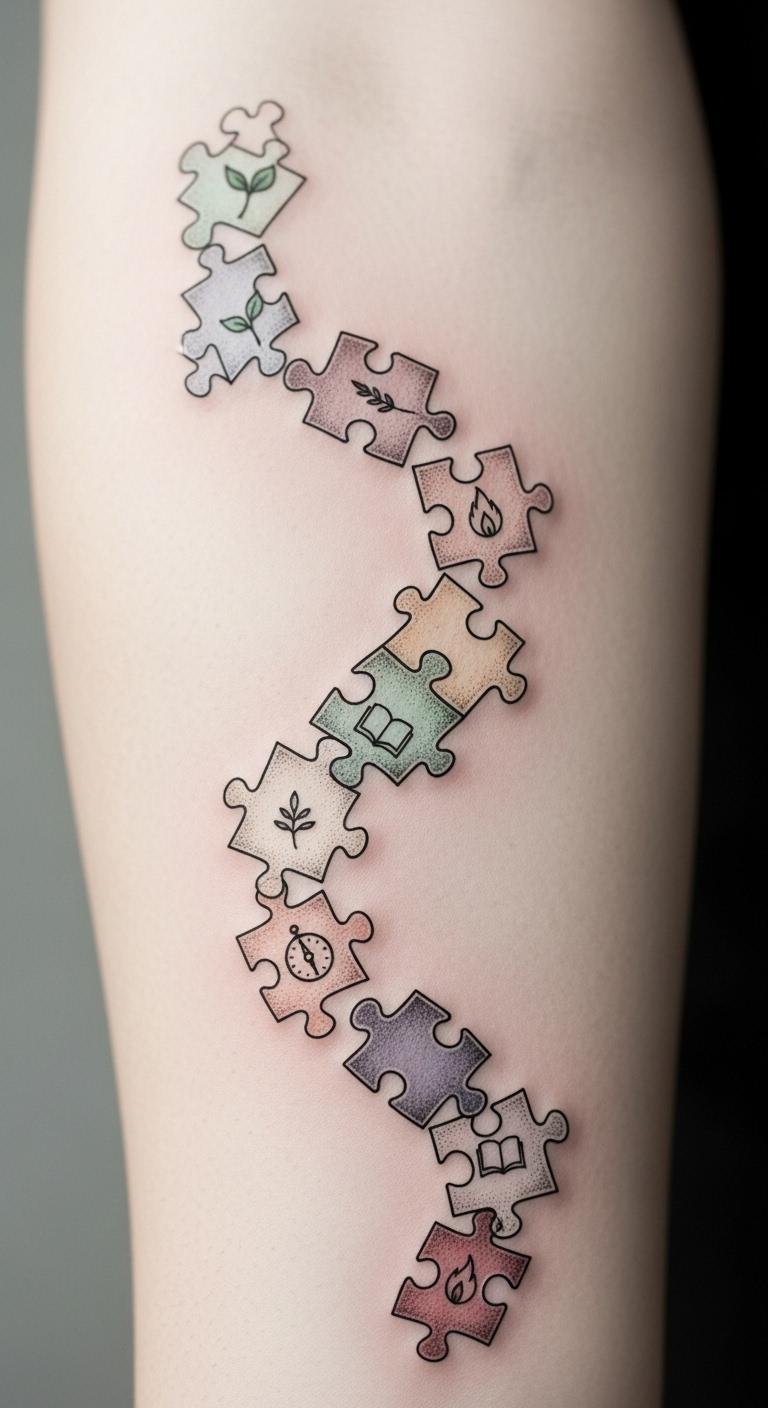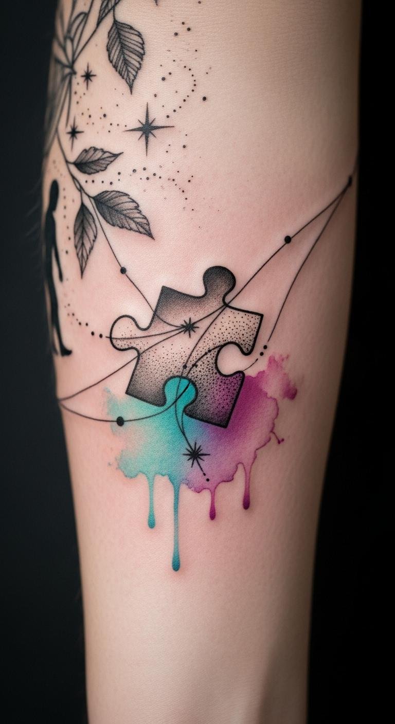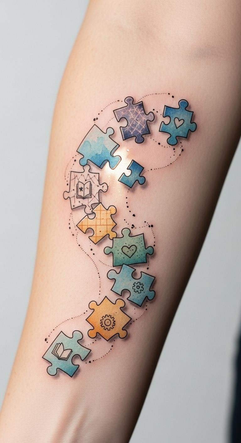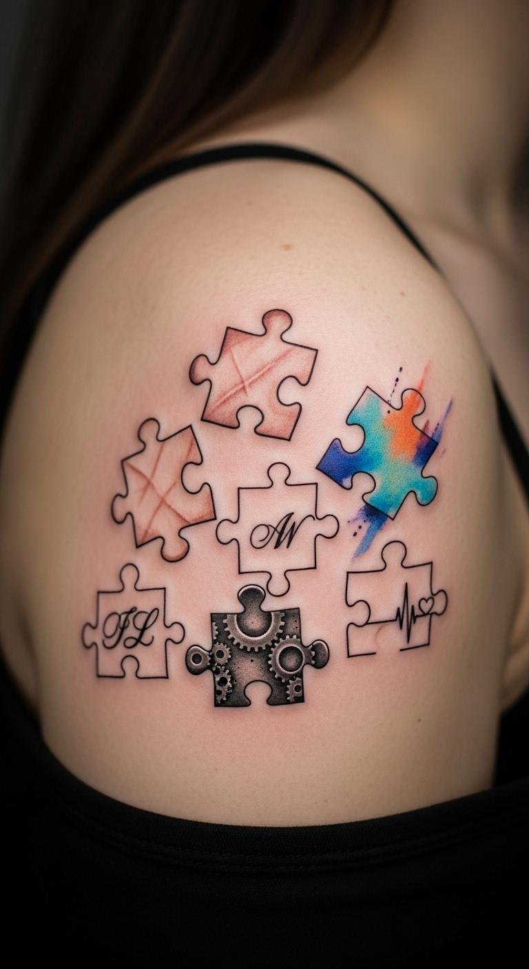 Artistry in puzzle piece tattoos often intertwines with deeper psychological meanings that resonate profoundly with individuals. These tattoos embody tattoo psychology by allowing you to express your unique journey and emotional expression. Each piece symbolizes resilience, identity, and connection, inviting you to celebrate your story. They transform personal struggles into visible affirmations of hope and belonging, reflecting the beautiful complexity of your life. For a design concept: arrange several interlocking puzzle pieces of varying sizes along the forearm or shoulder blade, each piece rendered with a different texture or small motif (watercolor wash, delicate linework, stippling, and a tiny word like “resilience”). Use muted earth tones with one vibrant accent piece to signify a pivotal moment. Symbolically, the interconnected pieces represent personal growth, relationships, and the process of healing; the contrasting styles within each piece express the multifaceted emotional landscape. Placement on the forearm offers visibility and daily affirmation, while the shoulder blade allows for a more private, contemplative placement that can be revealed selectively.