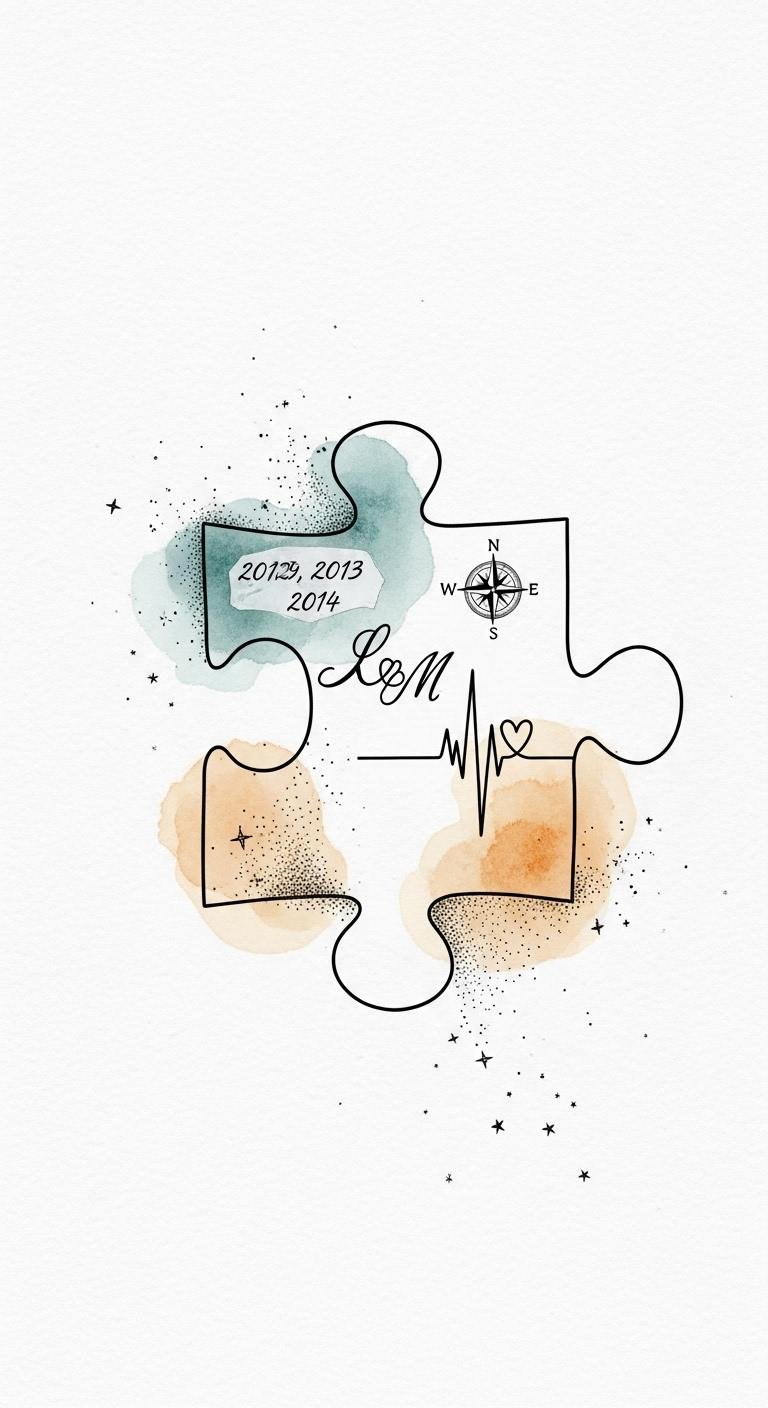 Delicate interlocking puzzle pieces rendered in fine black linework with subtle watercolor fills — each piece a different hue representing an individual — arranged to form a small cohesive cluster; optional tiny initials or meaningful icons (a heart, star, leaf) inked inside select pieces; placement ideas: inner wrist, behind the ear, ankle, or along the ribcage for a shared, intimate feel. This design symbolizes unity and individuality simultaneously, evoking warmth, belonging, and the comfort of chosen family; emotionally it honors shared history and personal growth, while placement choices allow for both visible celebration of connection and discreet reminders of togetherness.