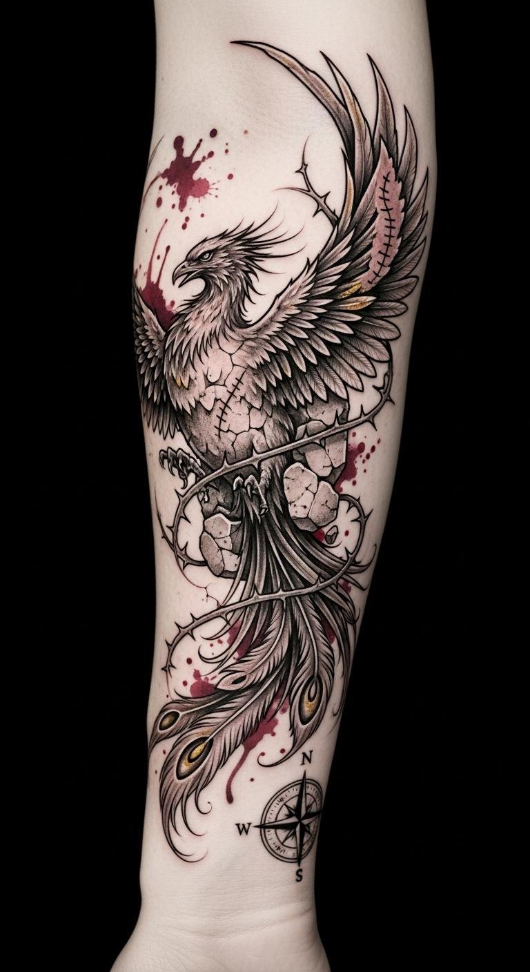 These designs embody personal empowerment and identity representation, reminding you of your inner strength and the battles you’ve bravely faced. This design symbolizes rebirth (phoenix) emerging from adversity (cracked stone) with the barbed vine representing challenges transformed into protection; watercolor accents convey emotional intensity while stitch-like feather details honor healing.