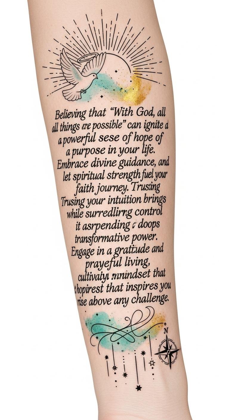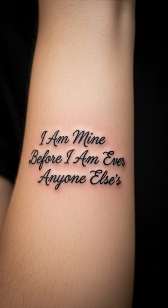 Emotionally the tattoo should feel reassuring and empowering. Ideal placement is the inner forearm for visibility and intimacy, allowing the wearer to read the text easily and reflect, though it can also wrap gently along the ribcage or down the calf for a more private expression.