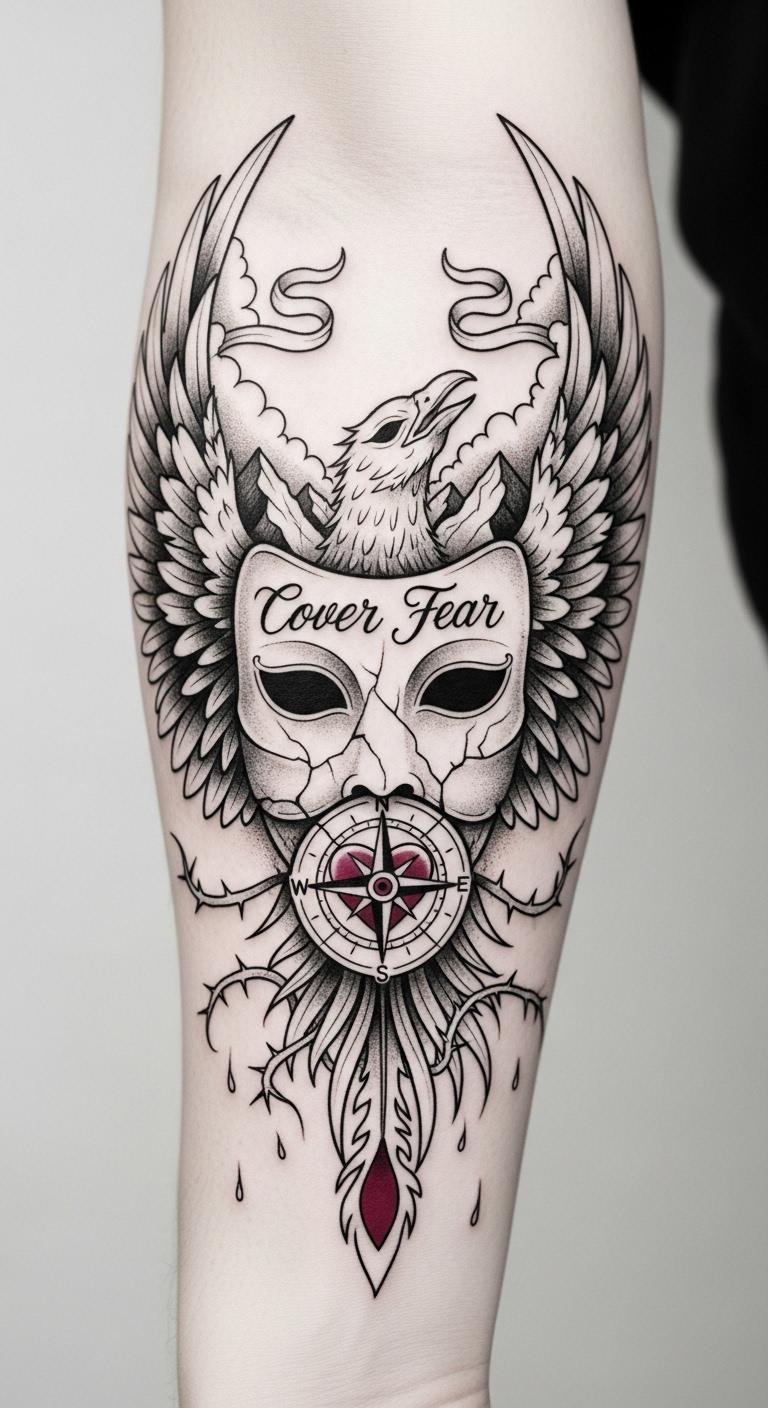 This design symbolizes rebirth (phoenix) emerging from concealment (cracked mask), the compass heart grounds intent and direction, while the mountains and clouds on the wings represent transcending obstacles; the falling vines show shedding limiting beliefs.