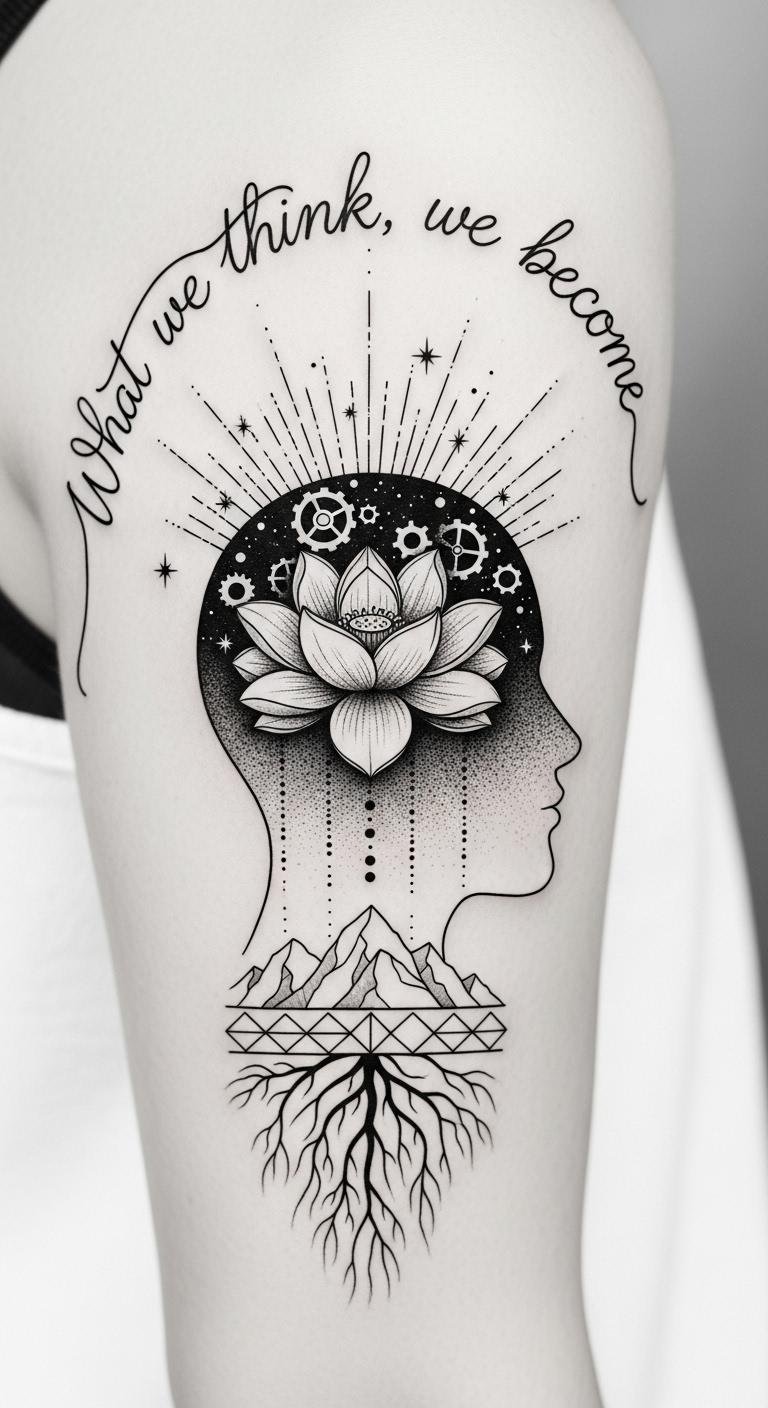 A compact tattoo marrying script and symbolic imagery: the quote arches like a guiding mantra above the head silhouette, the lotus inside the head represents mental transformation and blossoming, the gears hint at disciplined thought and goal-oriented action, the upward rays and stars convey visualization and aspiration, and the roots into geometric mountains ground the design as resilience and steady achievement.