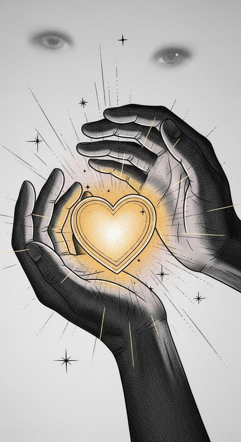 The design embodies “Faith Is Seeing Light With Your Heart: Internal Compass” by visualizing inner illumination breaking through external darkness; the heart-lantern represents faith as an inner guide, the hands as protection and acceptance, and the faint eyes and stars symbolize doubt and hope.