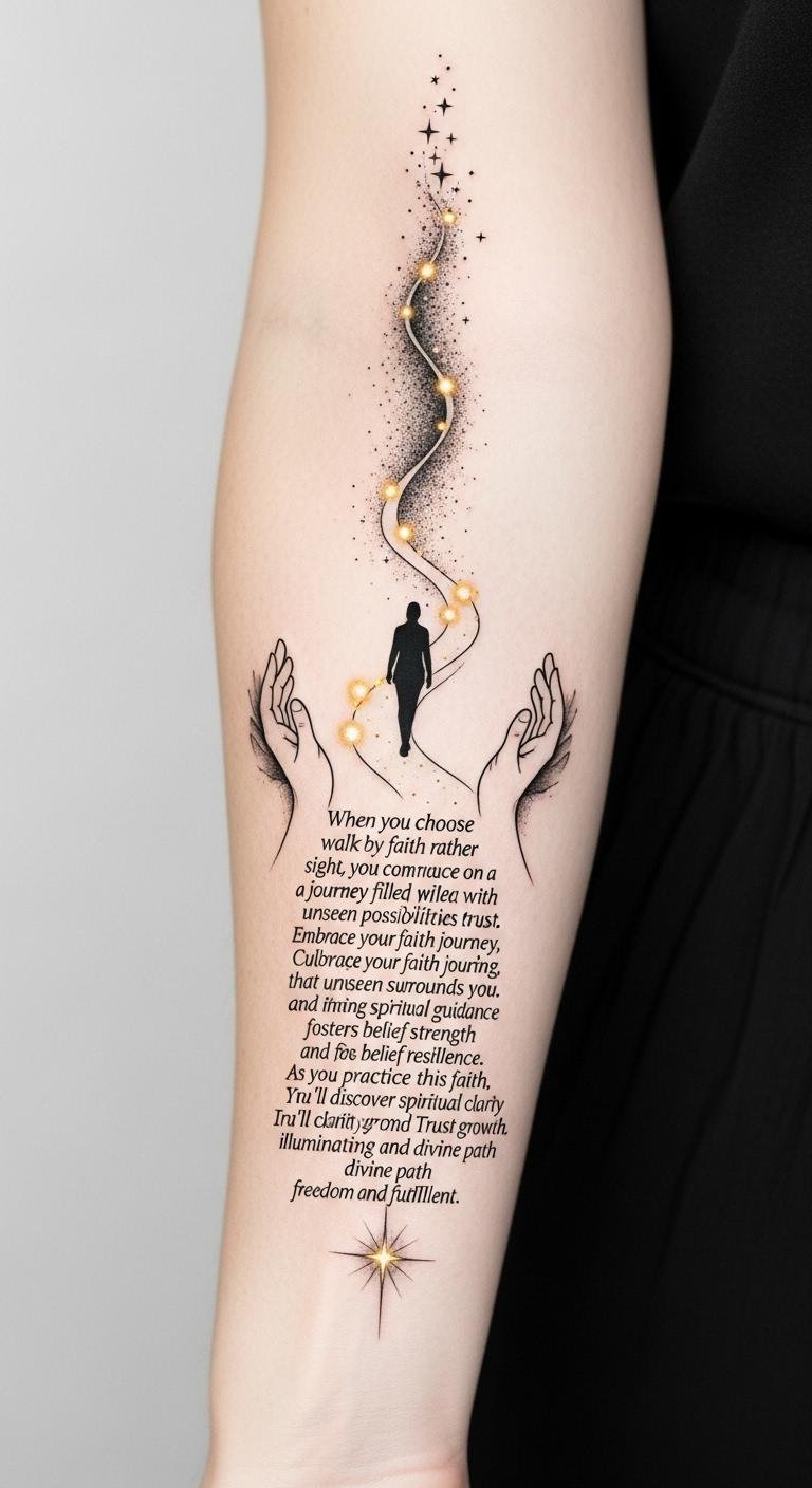 Glowing orbs mark moments of inner guidance and resilience, while the exact text woven along the trail turns the journey into a wearable mantra. Emotionally the tattoo invites calm courage and steady trust; ideal placement is the inner forearm for personal visibility or the calf for a more private reminder, sized to allow clear detail without crowding.