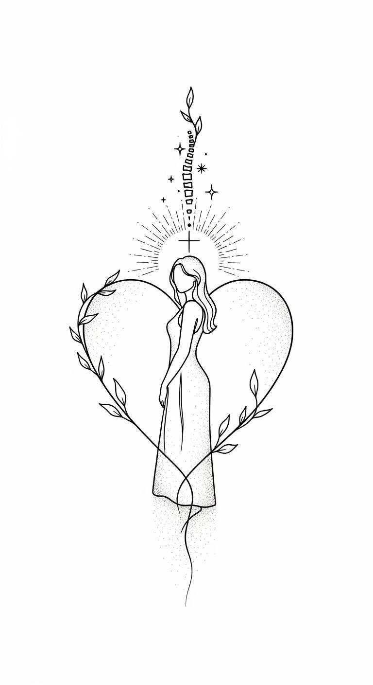 The design symbolizes inner resilience (the figure within the heart), divine presence (halo, cross), and growth (vine-spine), evoking calm confidence and protected vulnerability.