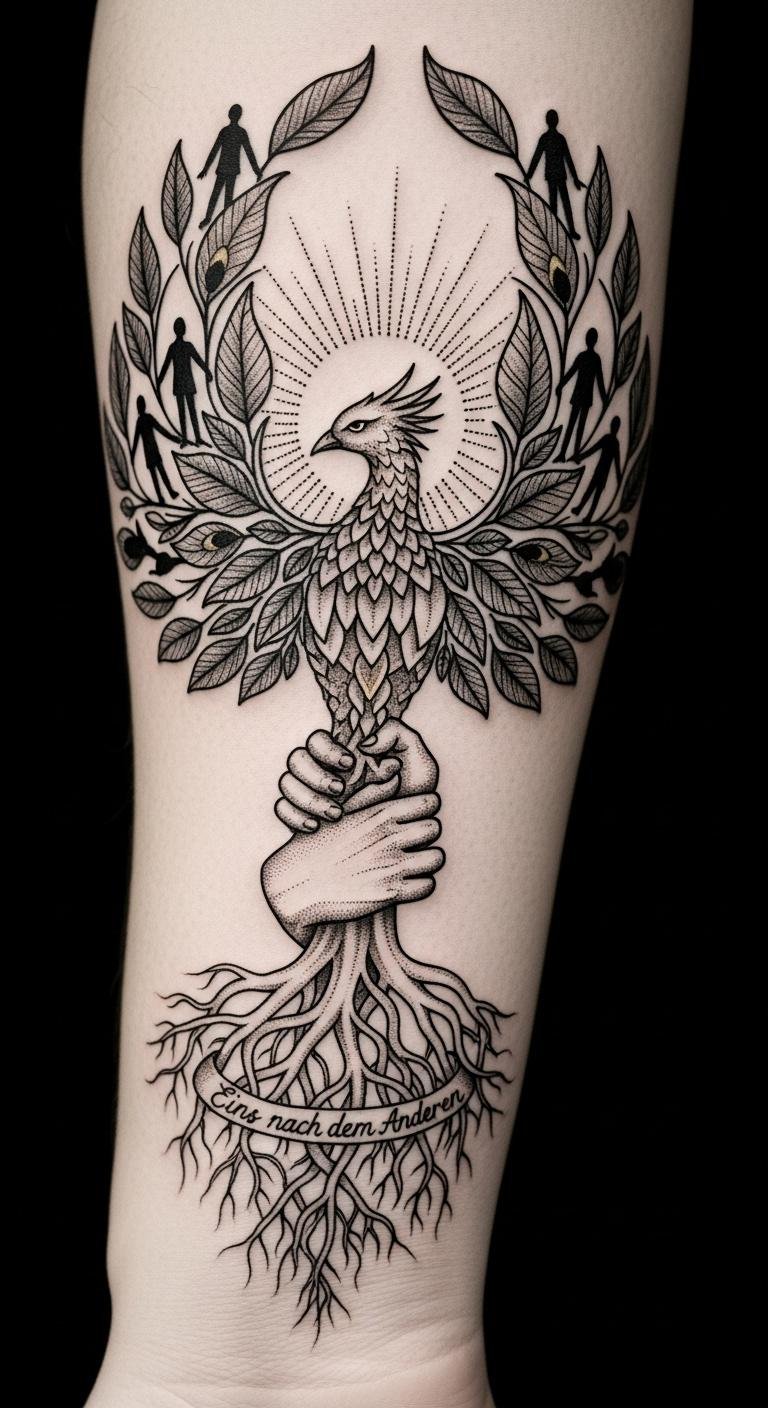 Ideal placement is a wrist-to-forearm wrap so the roots sit near the wrist (foundation) and the rising phoenix and sunburst follow the forearm toward the elbow, visible for personal reminder and public conversation.