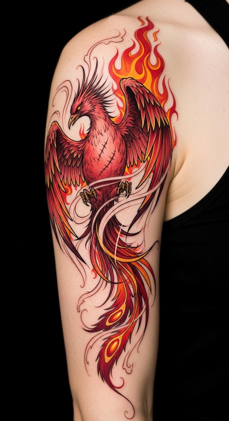 Place along the outer forearm for a visible daily reminder or across the shoulder blade for a larger, more private canvas; the scar-like feather details symbolize healed wounds and personal history, while the fiery colors evoke renewal, courage, and forward momentum.