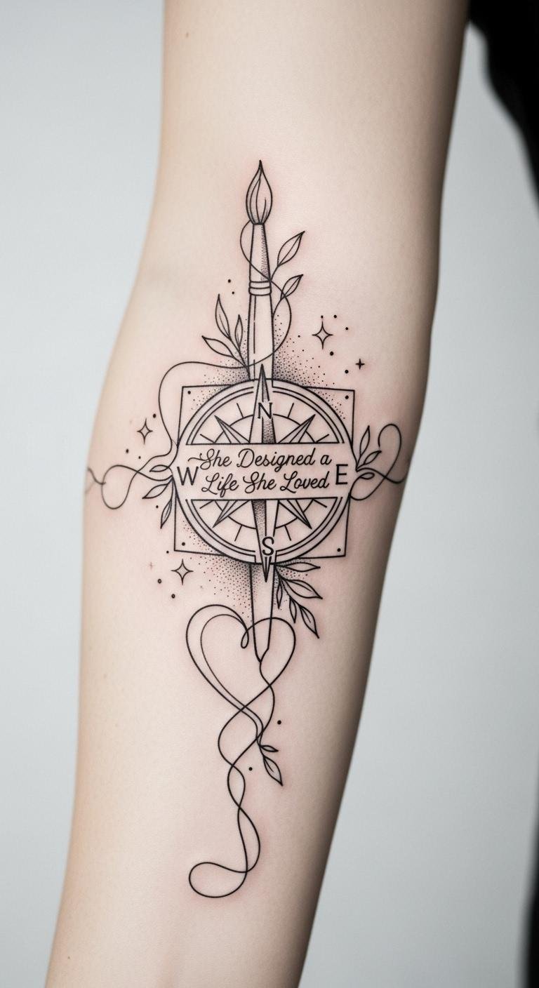 This design symbolizes intentionality (compass) guiding creative expression (paintbrush) and heartfelt authenticity (heart), with leaves for growth and stars for inspiration; the integrated phrase anchors the piece in personal mantra, while the minimal dotwork and fine lines evoke mindfulness and deliberate choices.